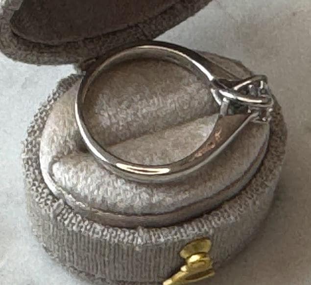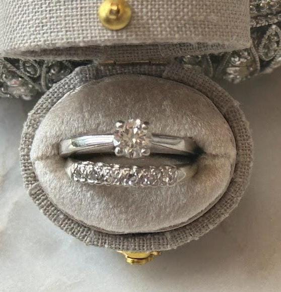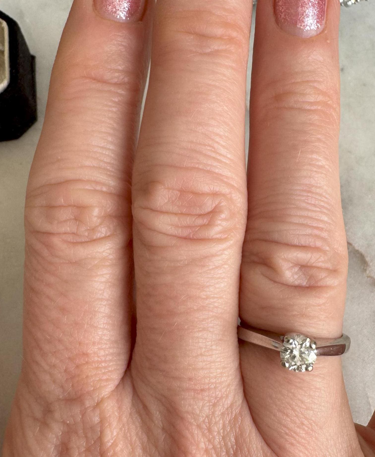 18 kt White Gold Round Brilliant .65 carat SI1 clarity G/H colorSize 5.53.35 gramsPre-ownedCondition good with minor surface wearBand not included, purchase separatelyBox shown not included, Beautifully packaged with 100% recycled materials