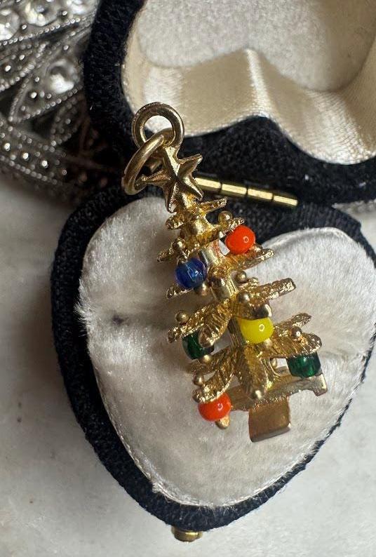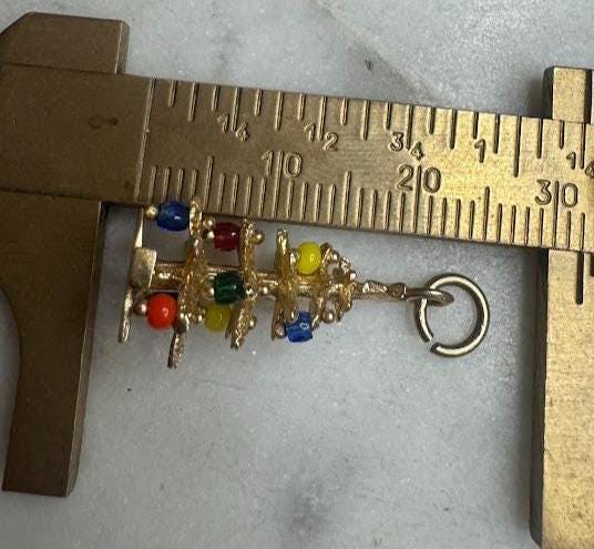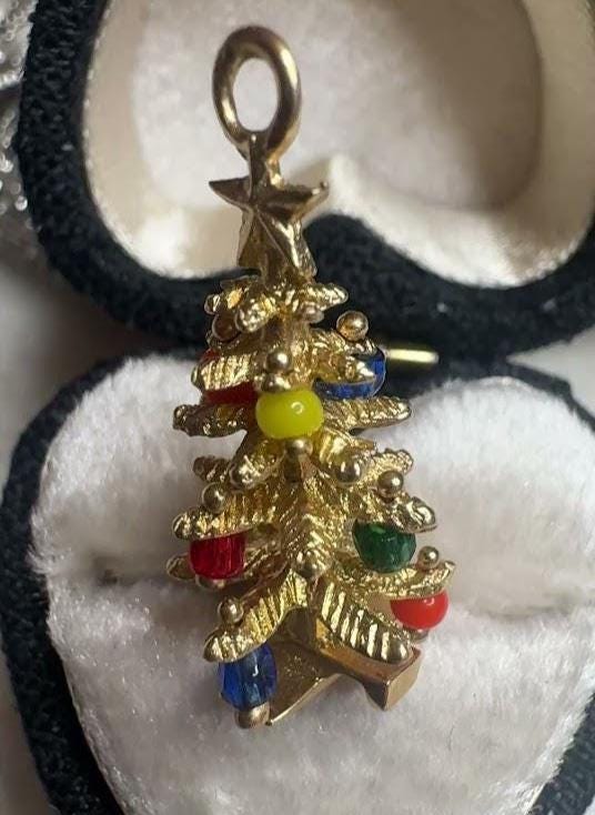 14 kt Yellow GoldChristmas Tree with Gem Trimmings5 gramsVintage, Pre-owned Condition Good with minor surface wearBox shown not included, Nicely packaged with 100% recycled material