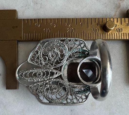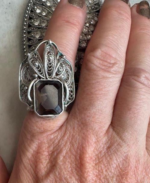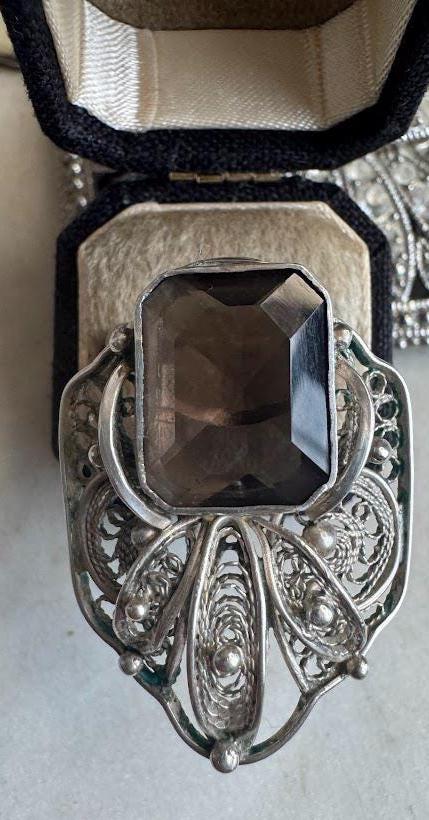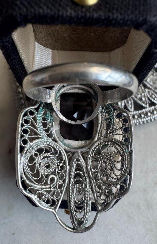 Sterling .925Smokey Quartz Emerald Cut Center Stone 155mmSize 85.26 gramsVintage Pre-owned Condition Good with minor surface wearBox shown not included, Beautifully packaged with 100% recycled materials