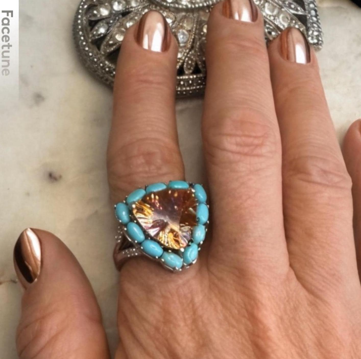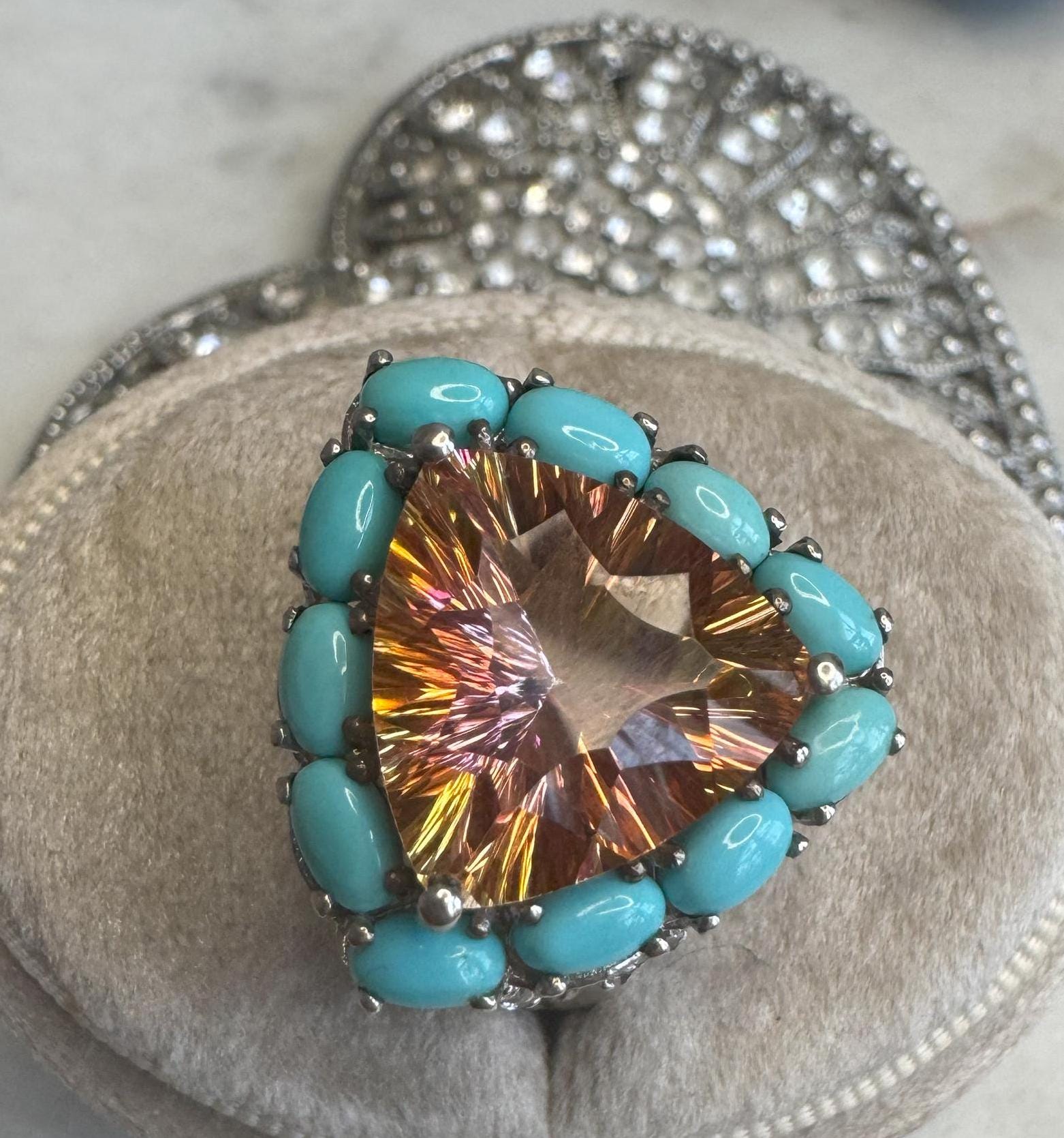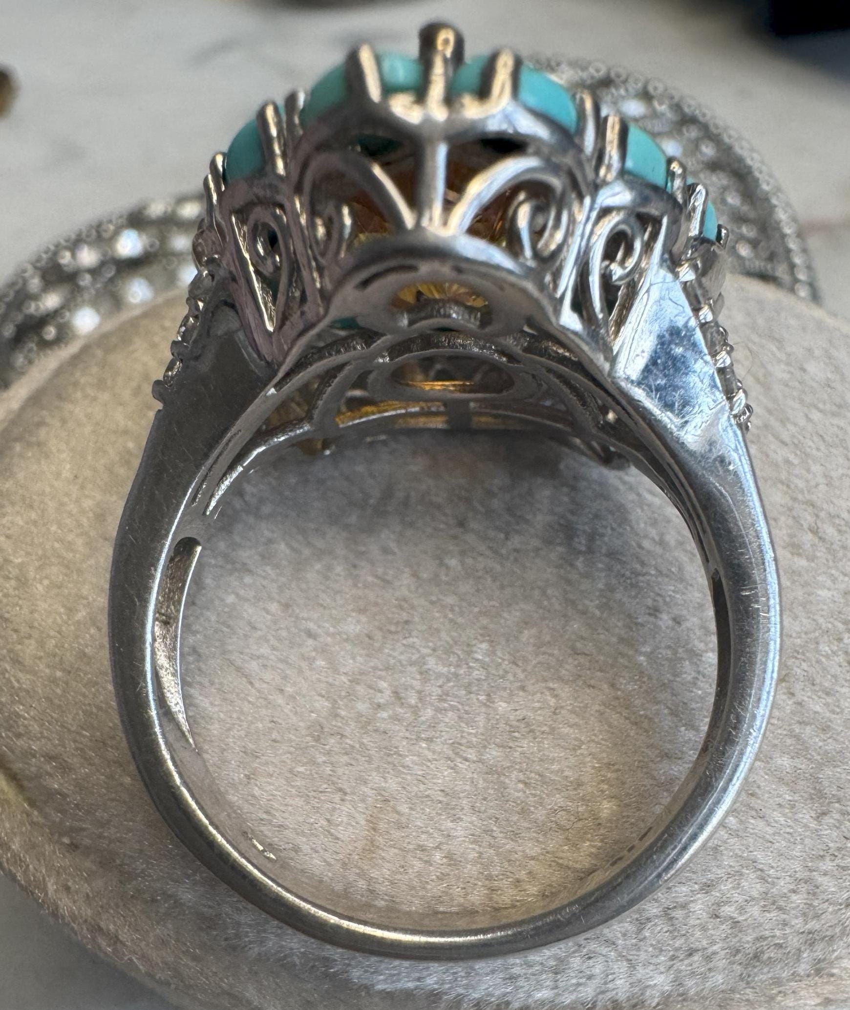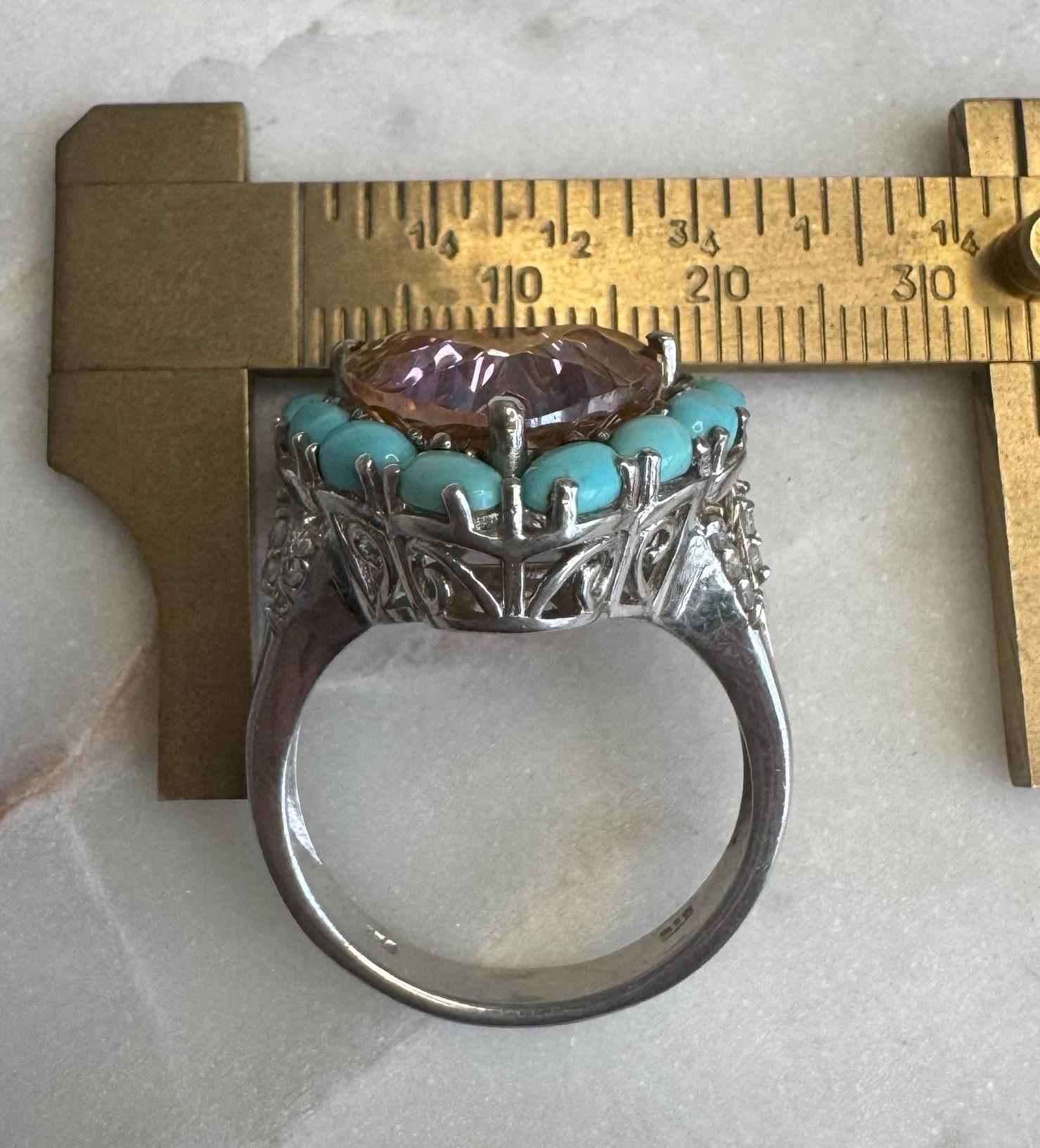 Sterling .925Peach CZ Center StoneSleeping Beauty Turquoise Accent StonesSize 108.44 gramsPre-owned Condition excellent with minor surface wearBox shown not included, Beautifully packaged with 100% recycled material