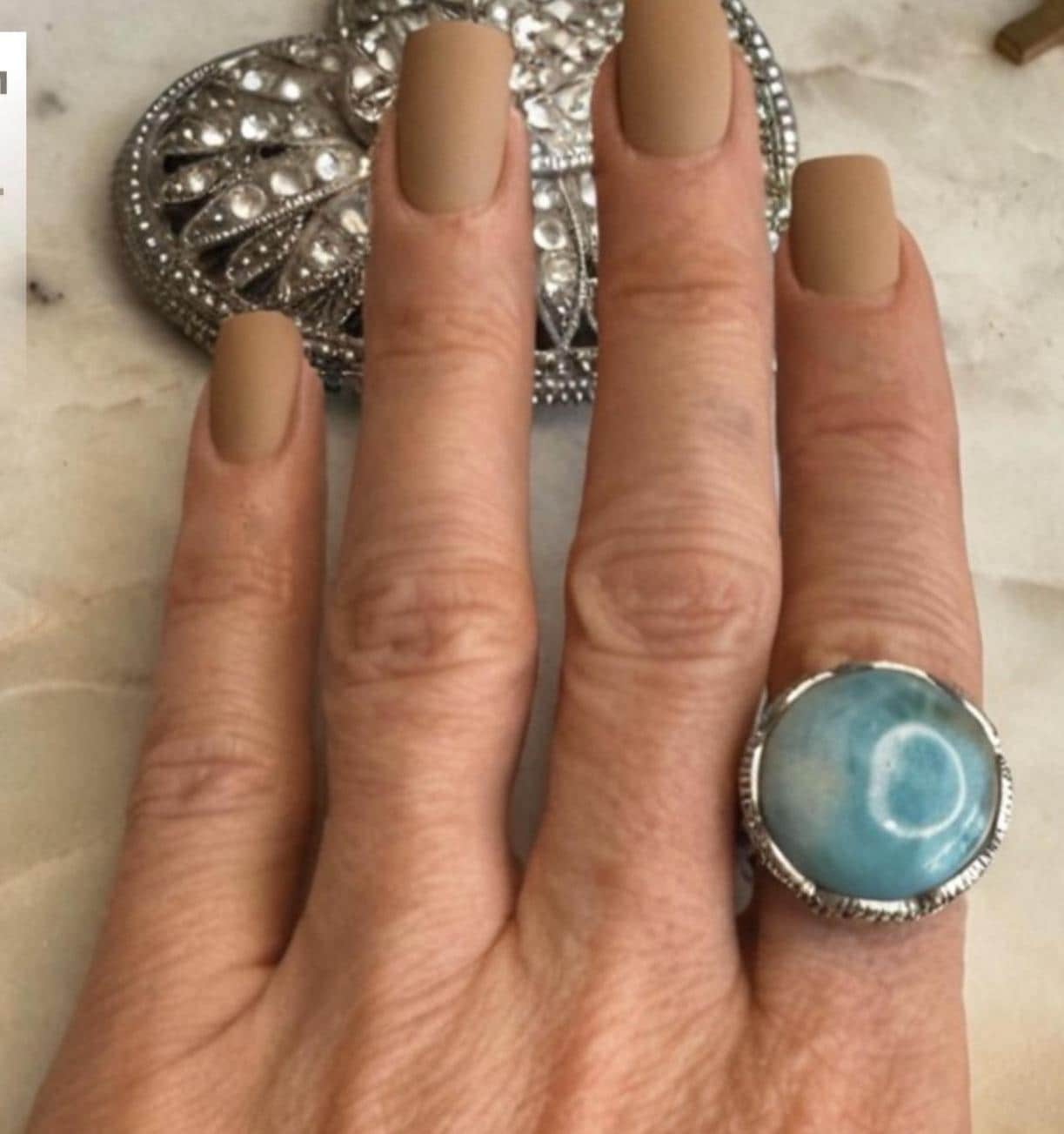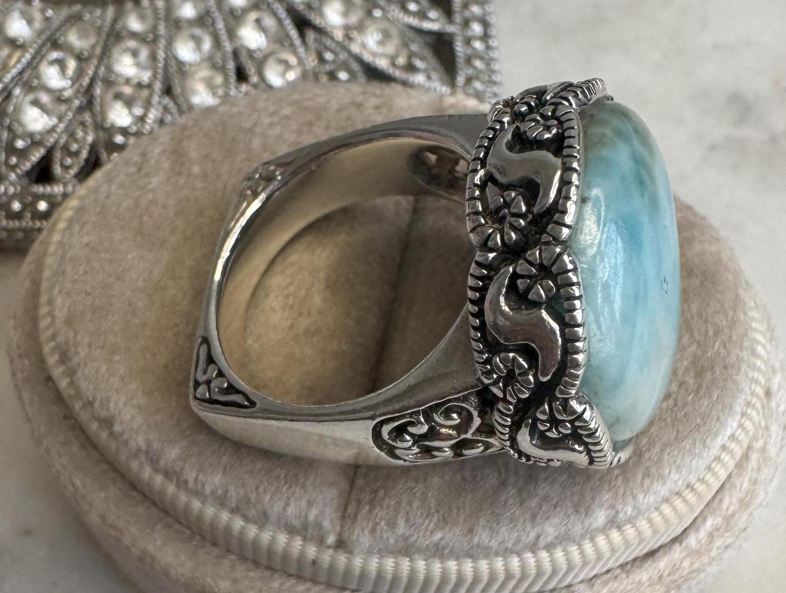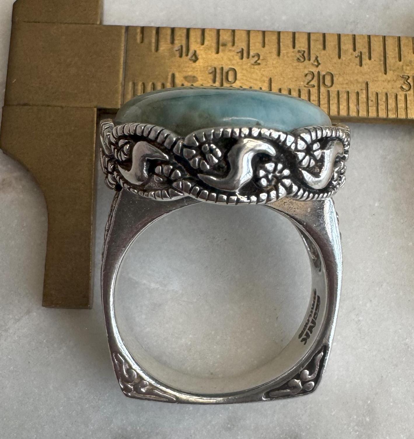 Sterling .925Ocean Jasper (looks like Larimar)Size 812.81 gramsVintage Pre-owned Condition good with minor surface wearBox shown not included, Beautifully packaged with 100% recycled material