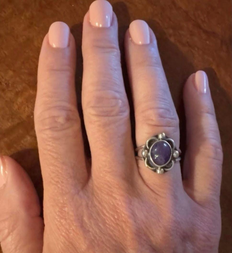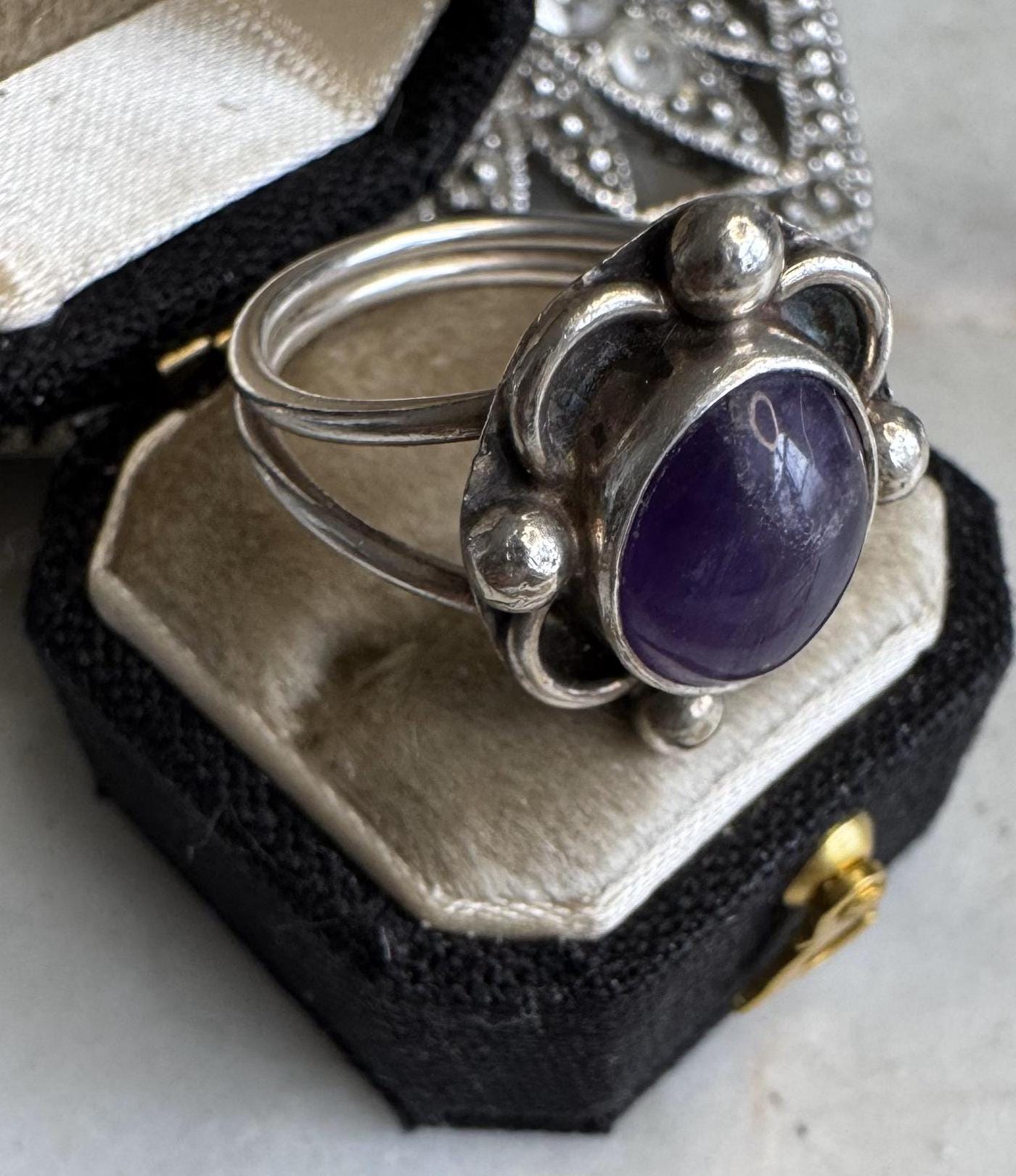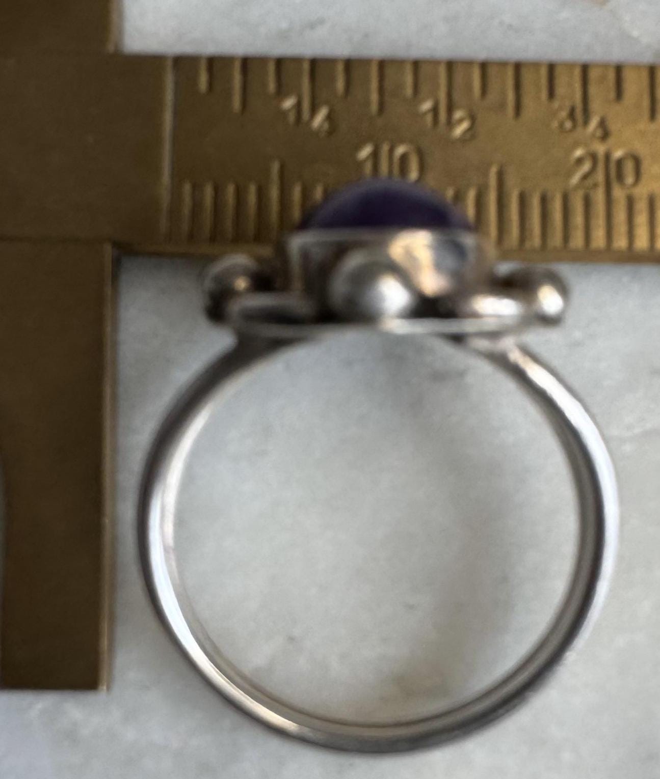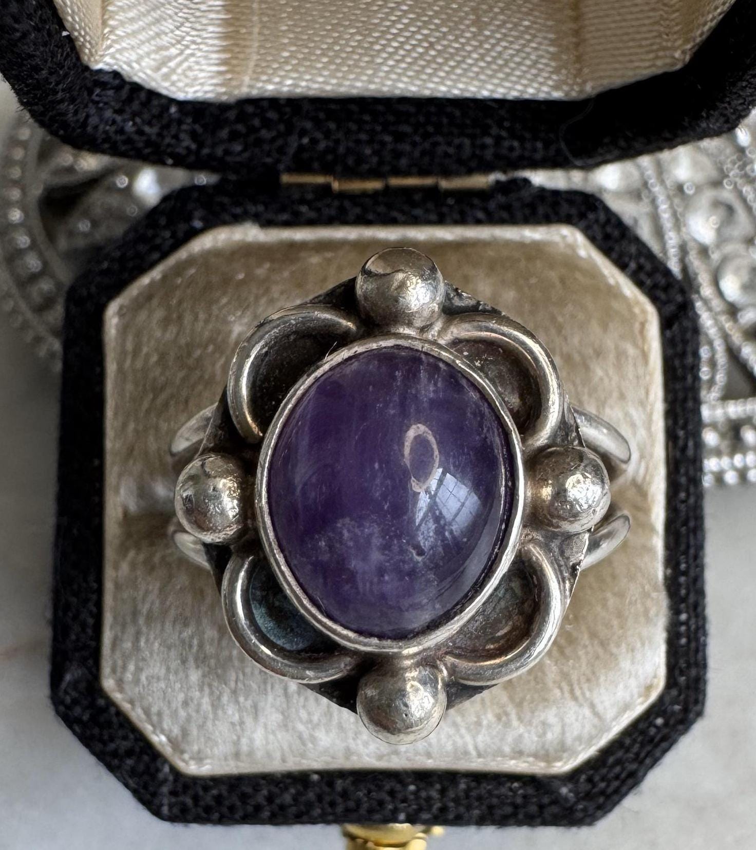 Sterling .925Cabochon Amethyst CenterSize 75 gramsVintage Pre-ownedCondition good with minor surface wearBox shown not included, Beautifully packaged with 100% recycled materials