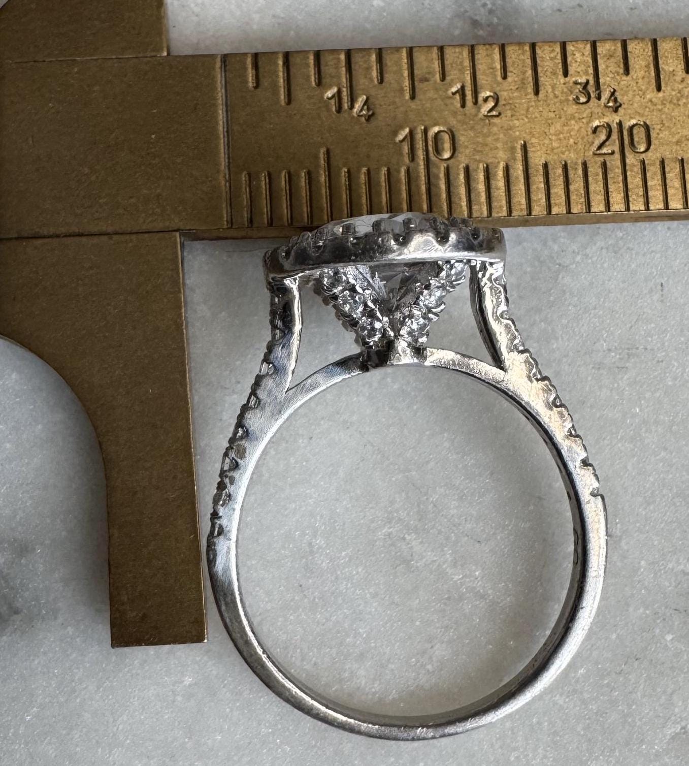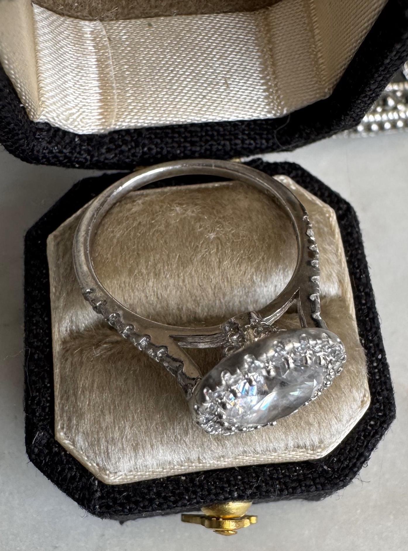 Sterling .92510 mm width stone approx 2 carat center CZ stoneSize 62.76 gramsPre-ownedCondition excellent with minor surface wearBox shown not included, Beautifully packaged with 100% recycled material