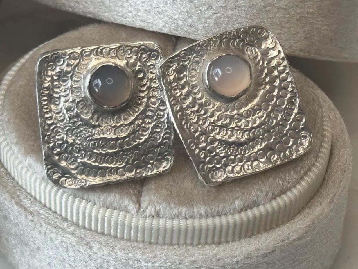 Sterling .925Moonstone Center StonePost pierced earrings5.47 gramsPre-owned Condition excellent with minor surface wearBox shown not included, Beautifully packaged with 100% recycled material