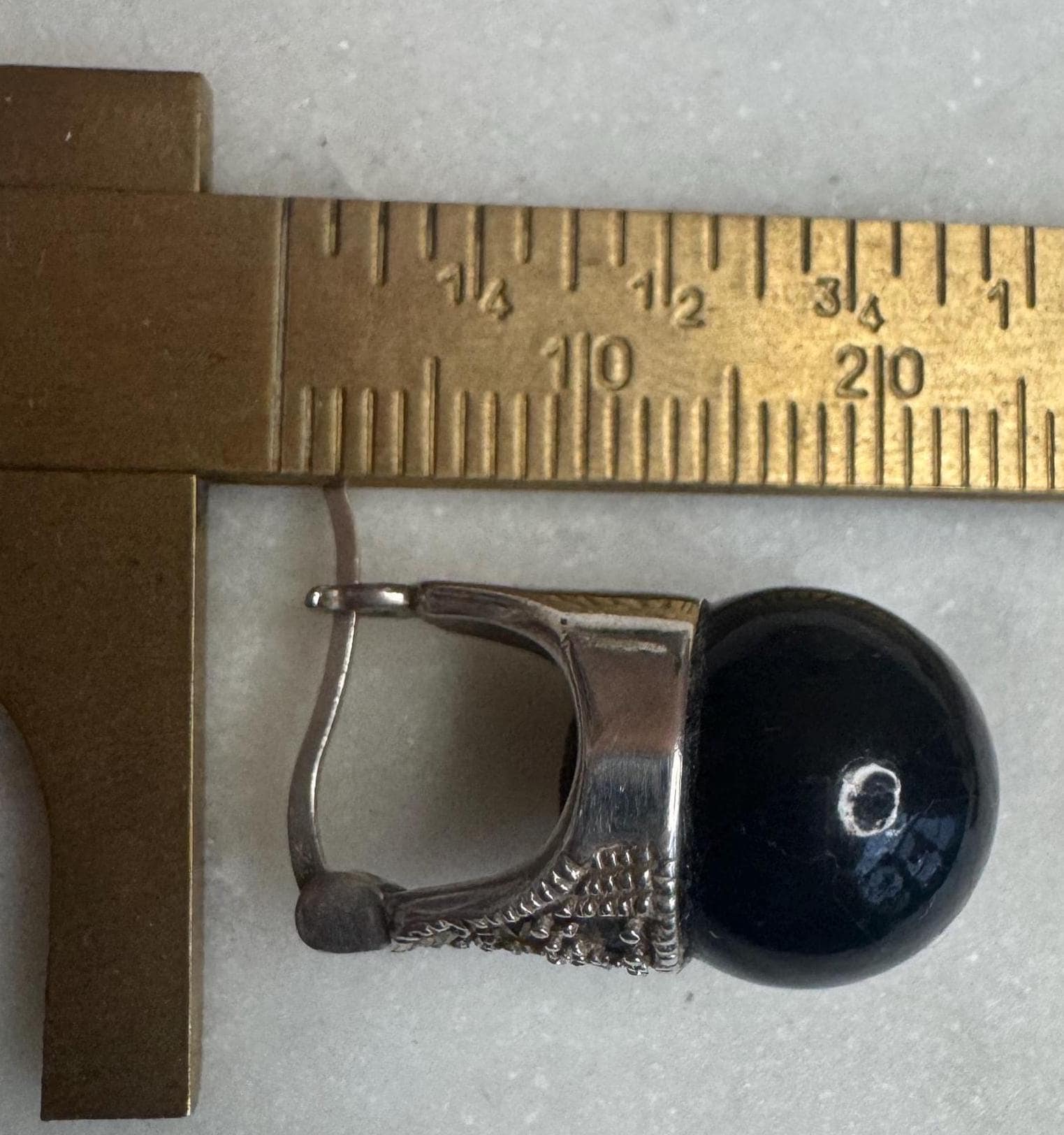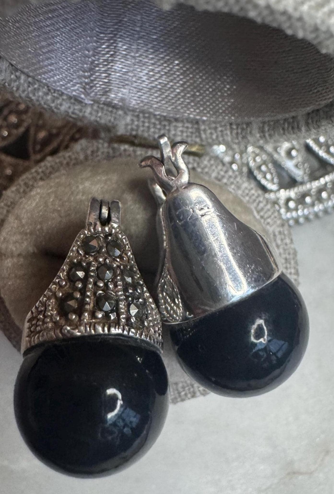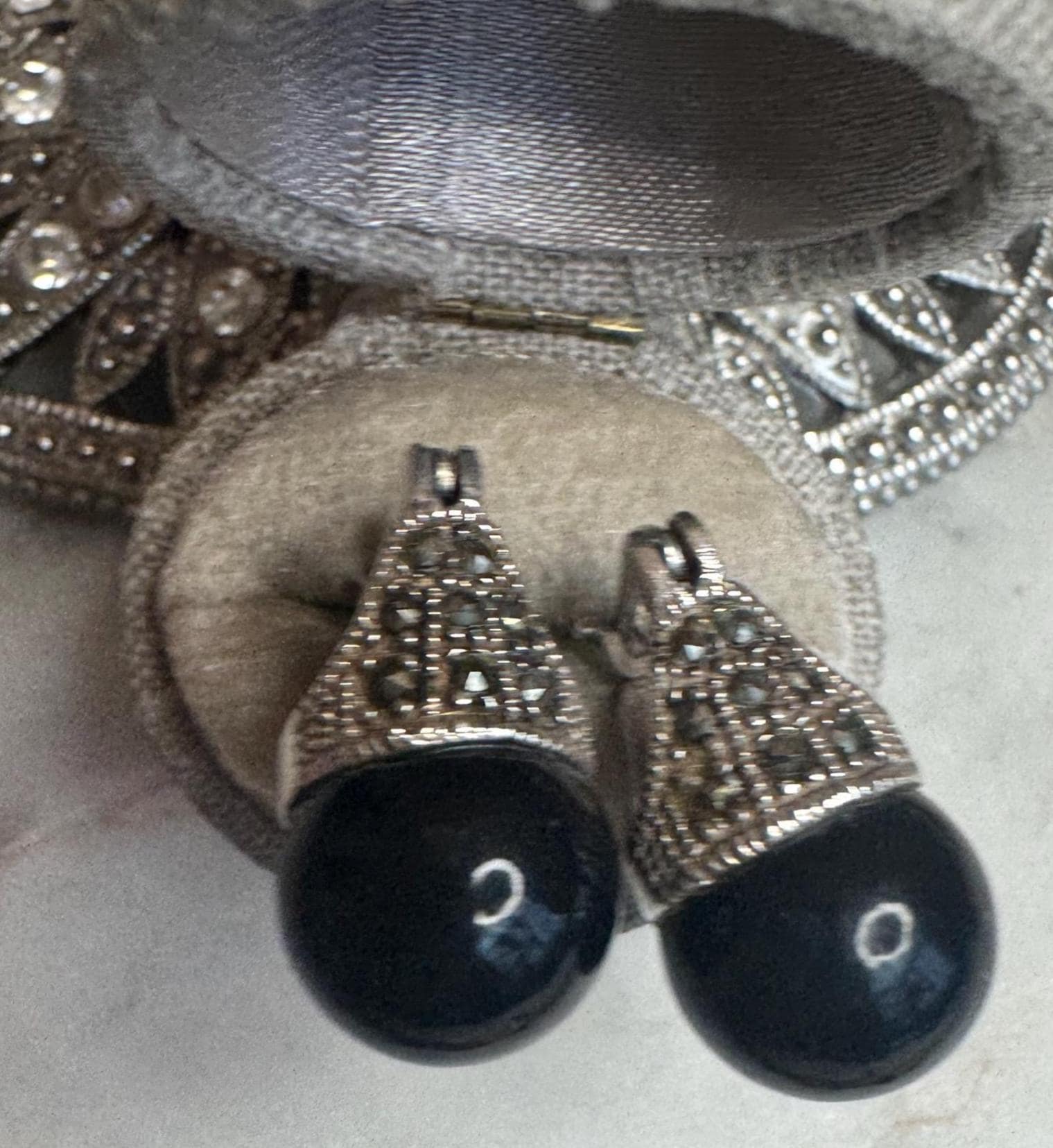 Sterling .925Marcasite & Black OnyxPost pierced earrings6.13 gramsVintage Pre-owned Condition excellent with minor surface wearBox shown not included, Beautifully packaged with 100% recycled material