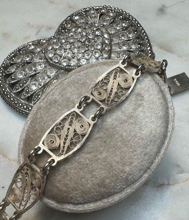 Sterling .925 Antique Filigree Design7in lengthBox link clasp9.59 gramsVintage Antique Pre-ownedCondition excellent with minor surface wearBox shown not included, Beautifully packaged with 100% recycled material
