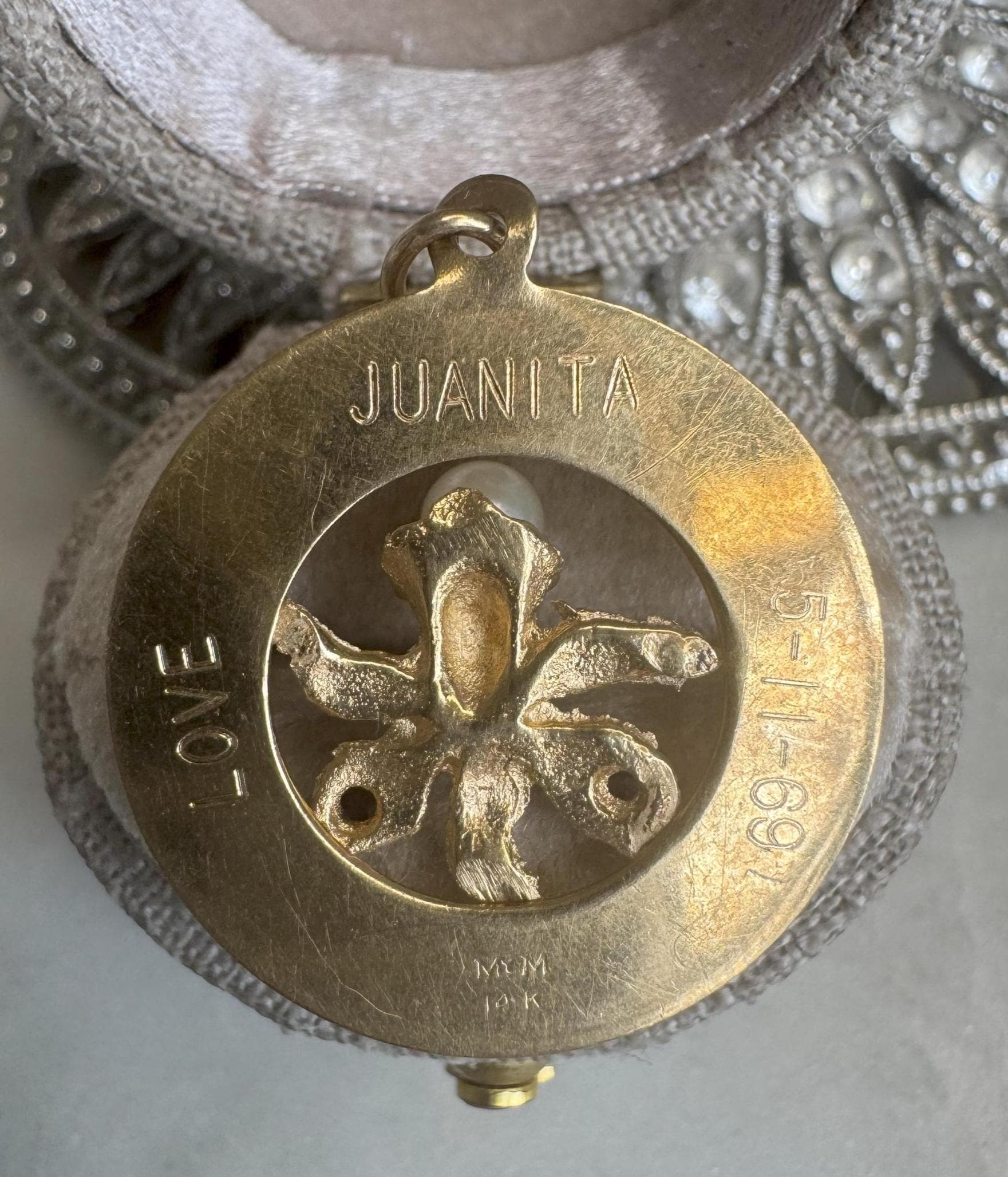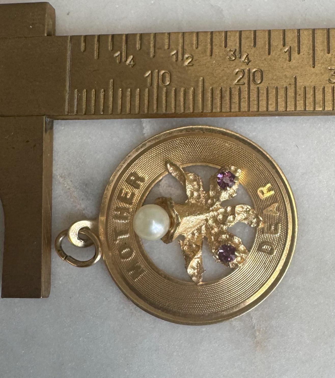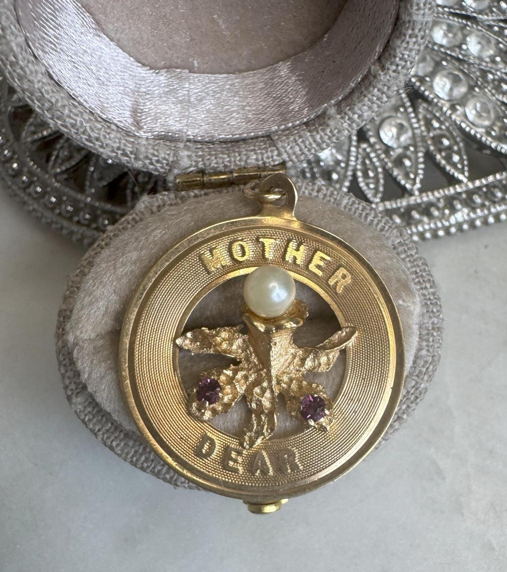 14kt Yellow Gold CharmPearl & Ruby "Mother Dear" Pendant Charm2.11 gramsVintage Pre-owned Inscribed Love, Juanita, 5/11/69Condition Good with minor surface wearBox shown not included, Beautifully packaged with 100% recycled material