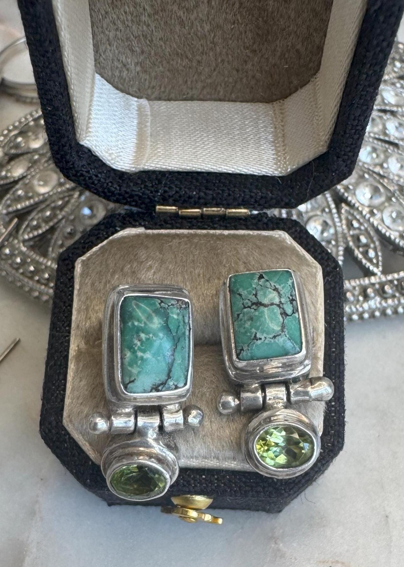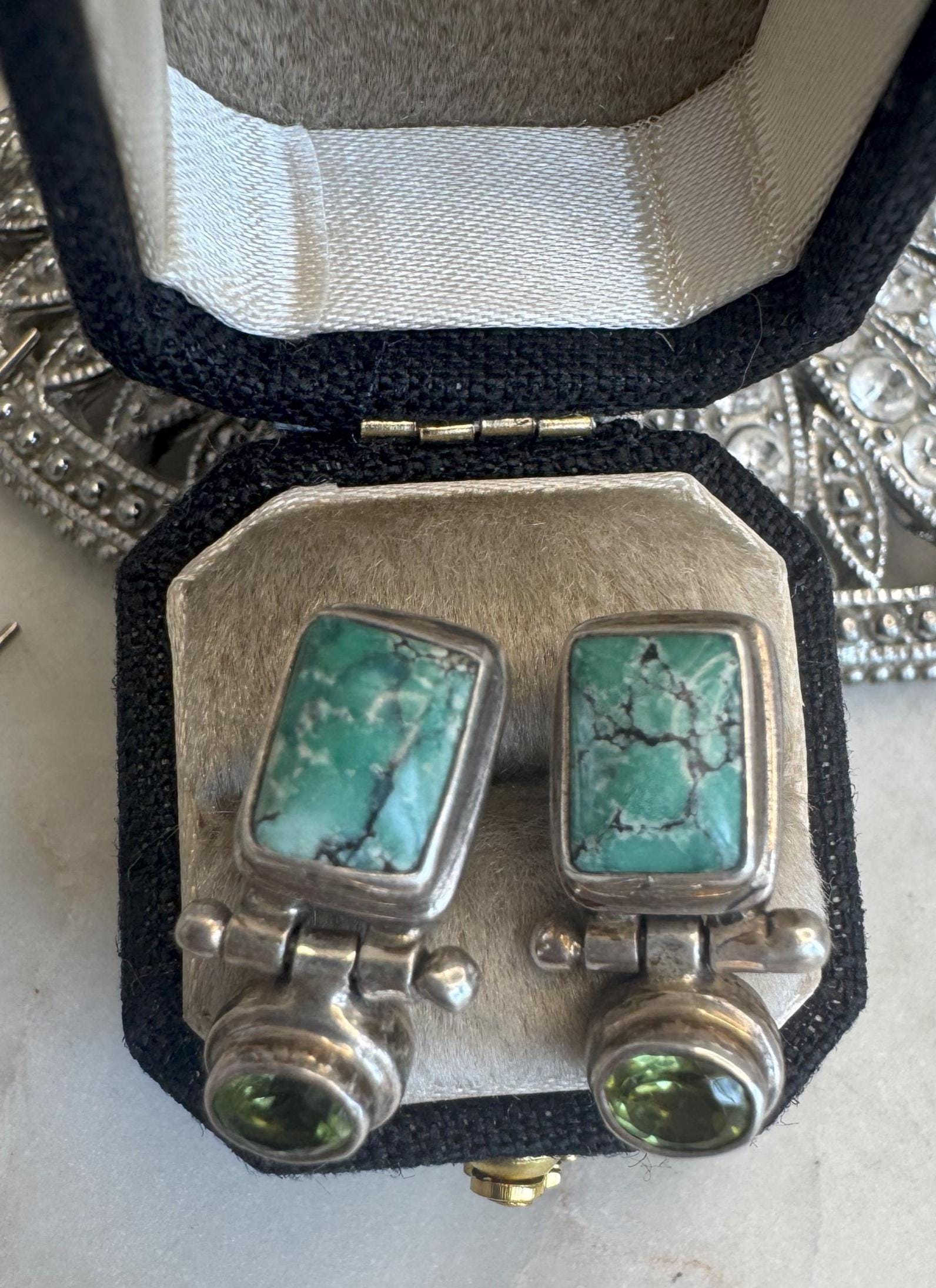 Sterling .925 Variscite & Peridot EarringsPost pierced earring6.36 gramsPre-owned Designer Marked Sarda Condition good with minor surface wearBox shown not included, Beautifully packaged with 100% recycled materials