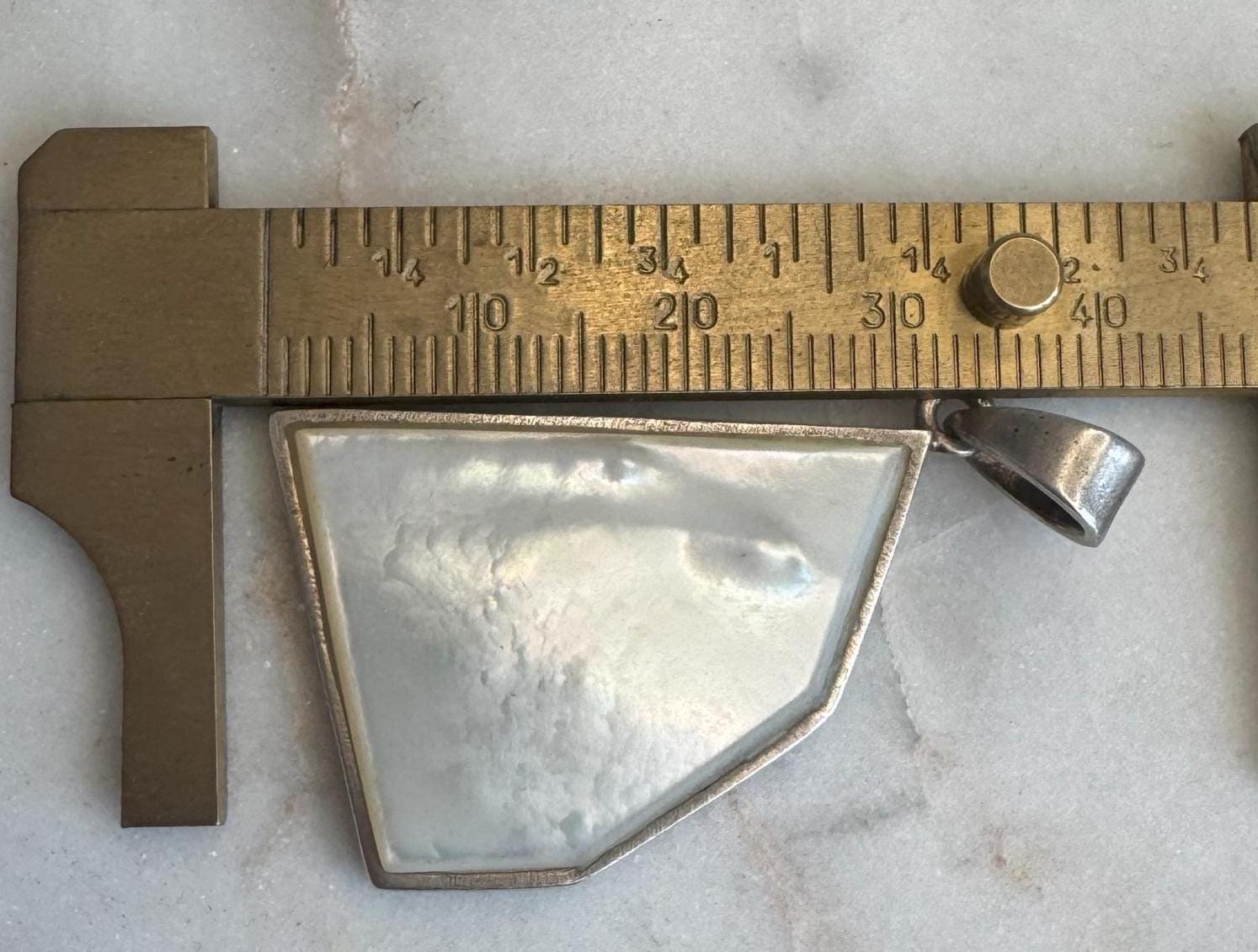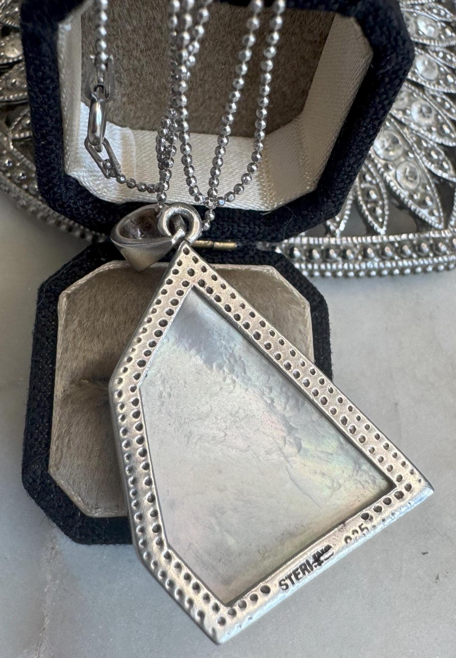Sterling .925Mother of Pearl Freeform PendantBeaded 16in chain NEWSpring ring clasp8.35 gramsVintage Pre-owned NEW CHAINCondition good with minor surface wearBox shown not included, Beautifully packaged with 100% recycled material