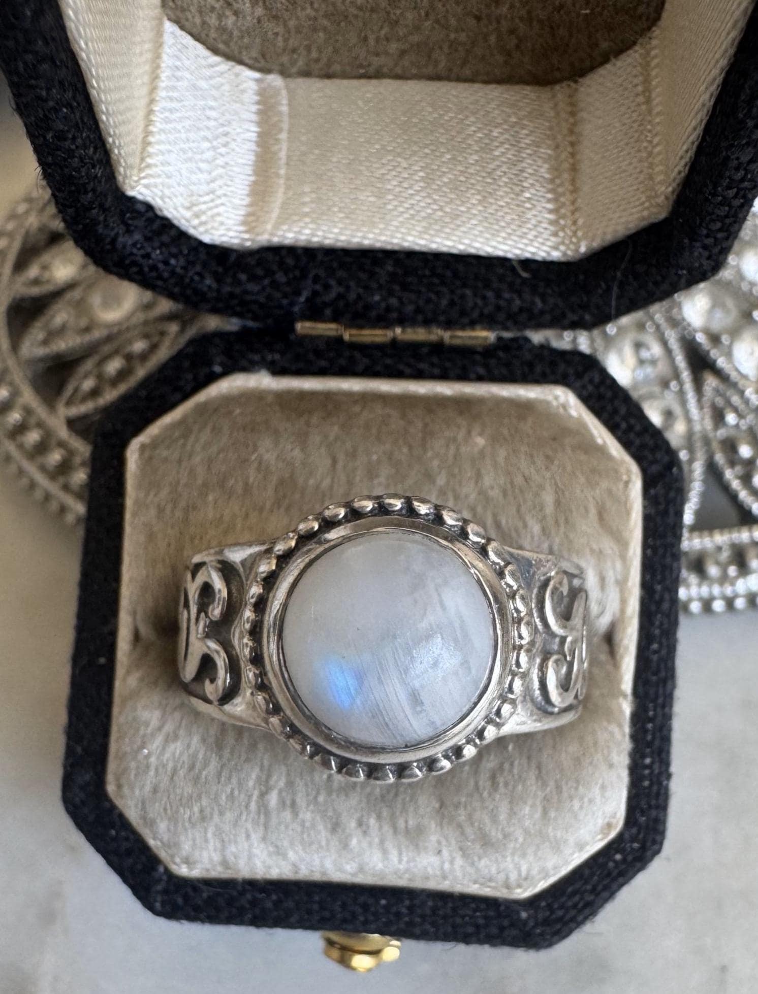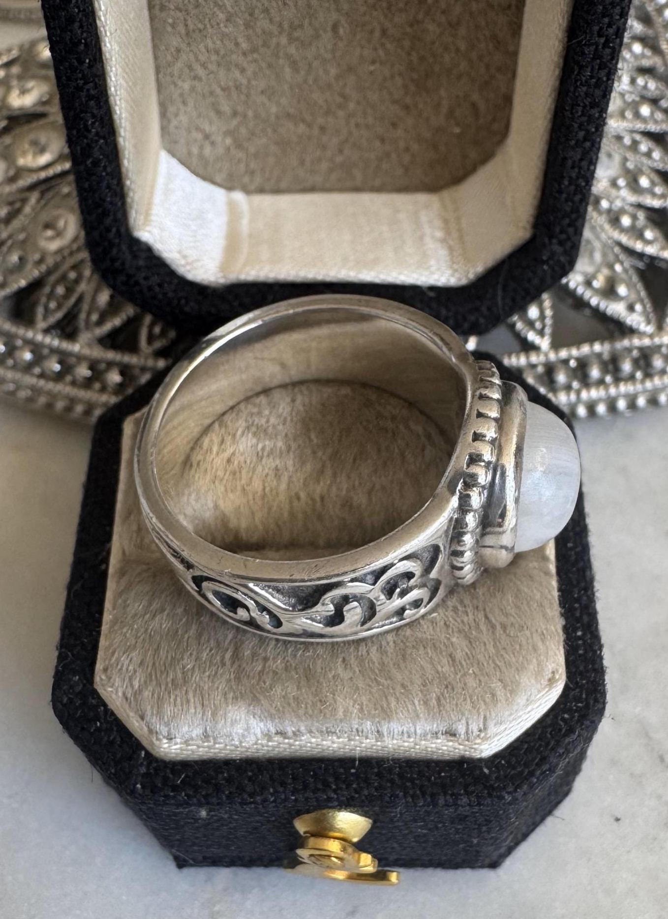 Sterling .925Moonstone Center StoneSize 55.21 gramsVintage Pre-owned Condition good with minor surface wearBox shown not included, Nicely packaged with 100% recycled material