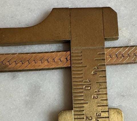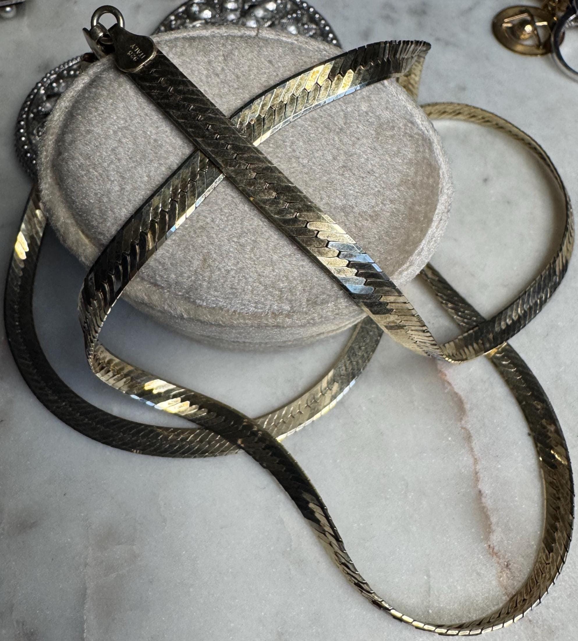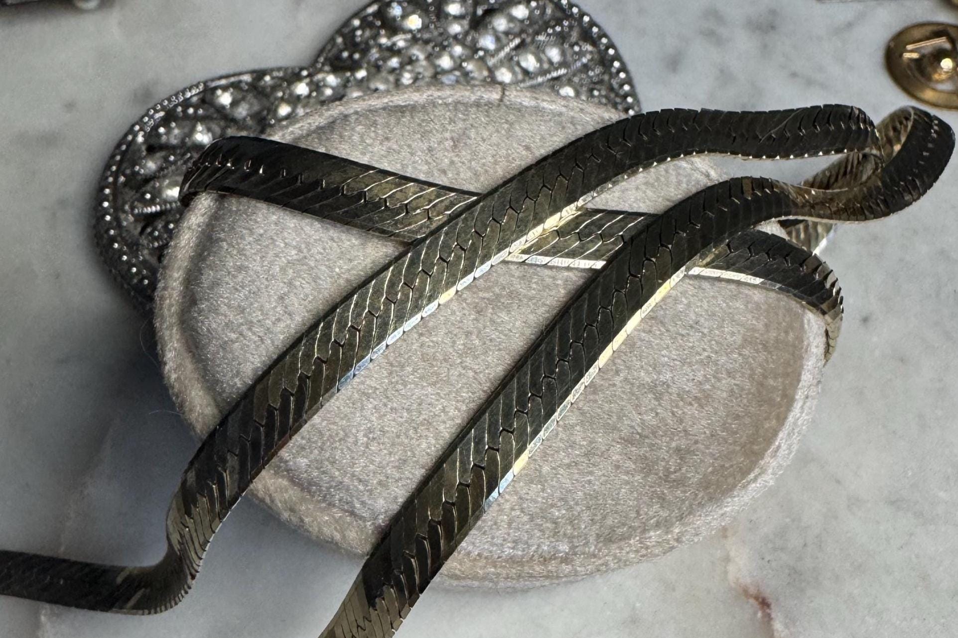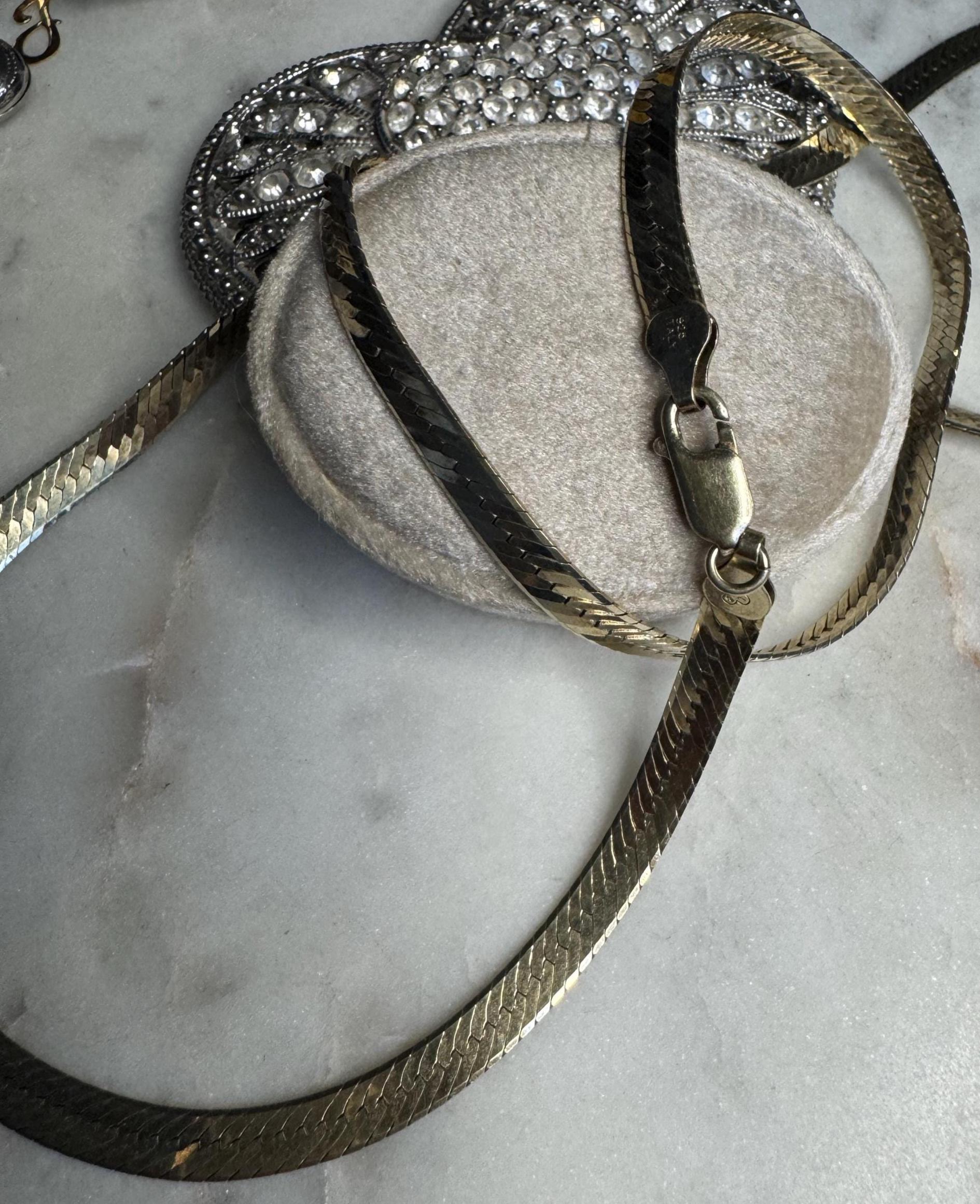 Sterling .925Herringbone Chain, Gold overlayLength 30in, 4mmLobster claw clasp25.61 gramsVintage Pre-owned Condition excellent with minor surface scratchesMade in Italy Marked