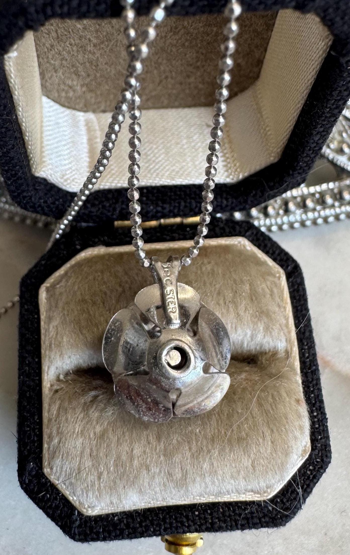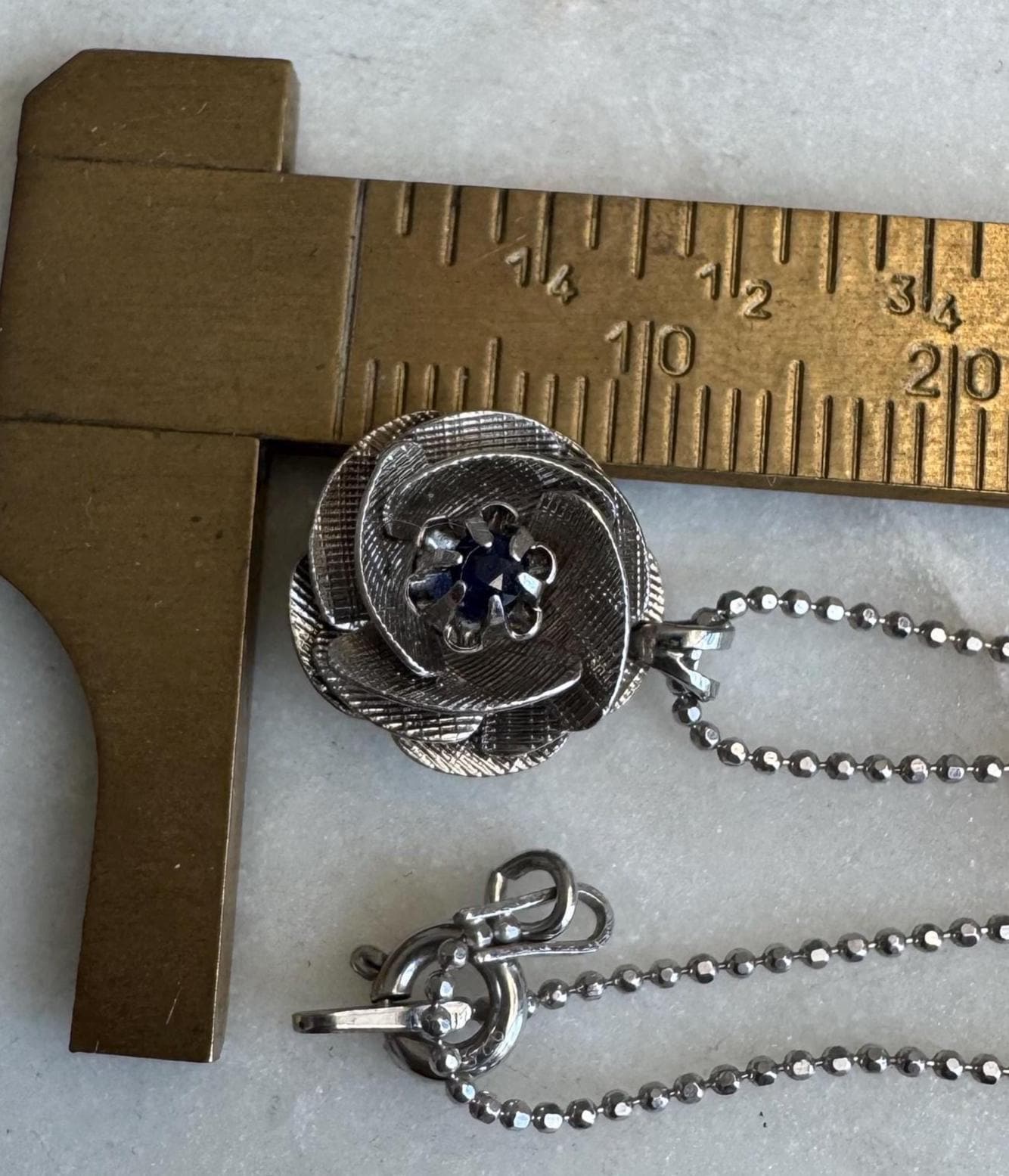 Sterling .925Rose Design with Blue SapphireBeaded 16in chain NEWSpring ring clasp2.54 gramsVintage Pre-owned NEW CHAINCondition excellent with minor surface wearBox shown not included, Nicely packaged with 100% recycled material