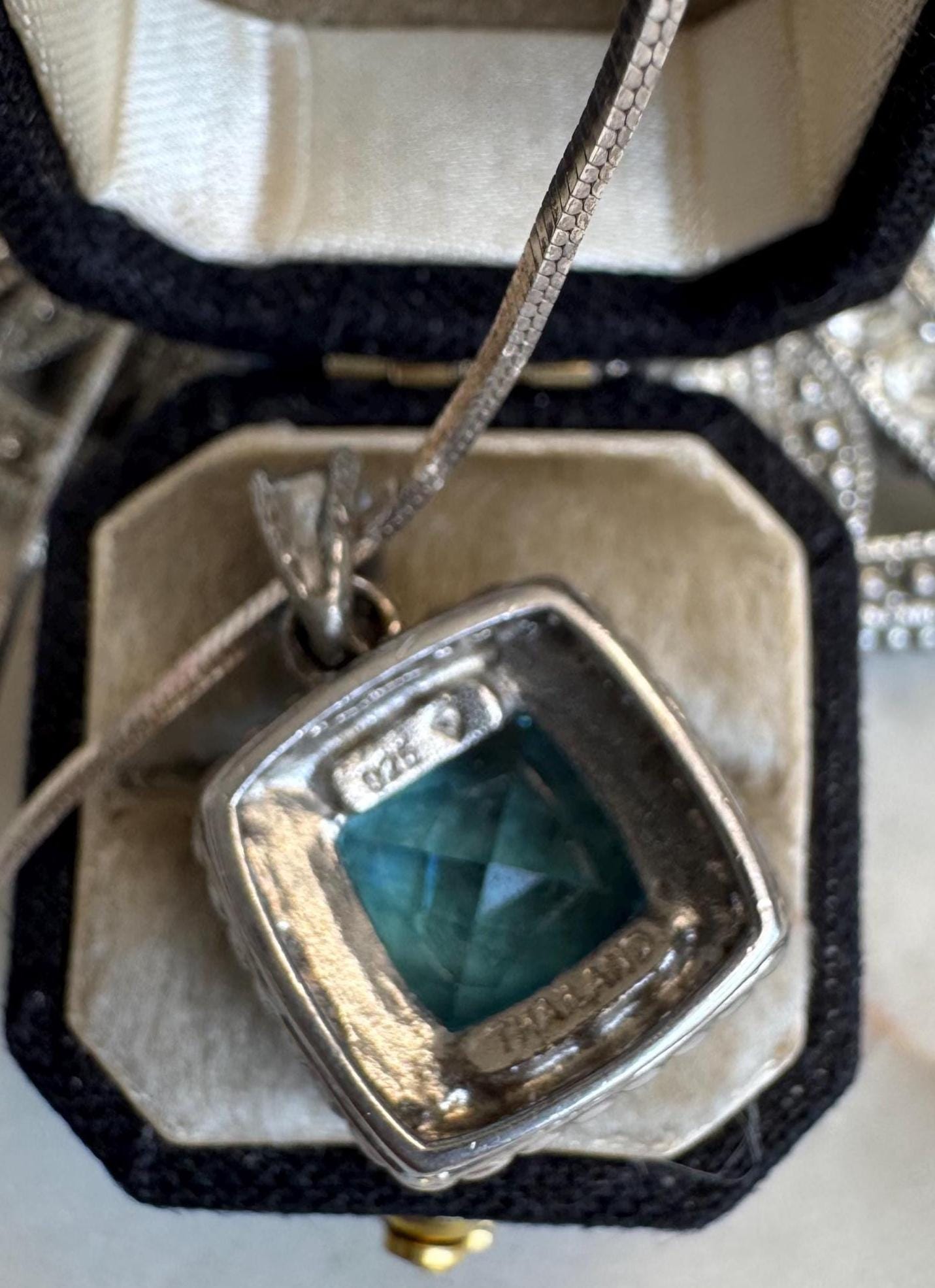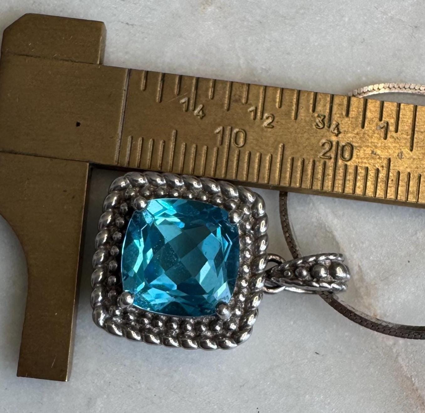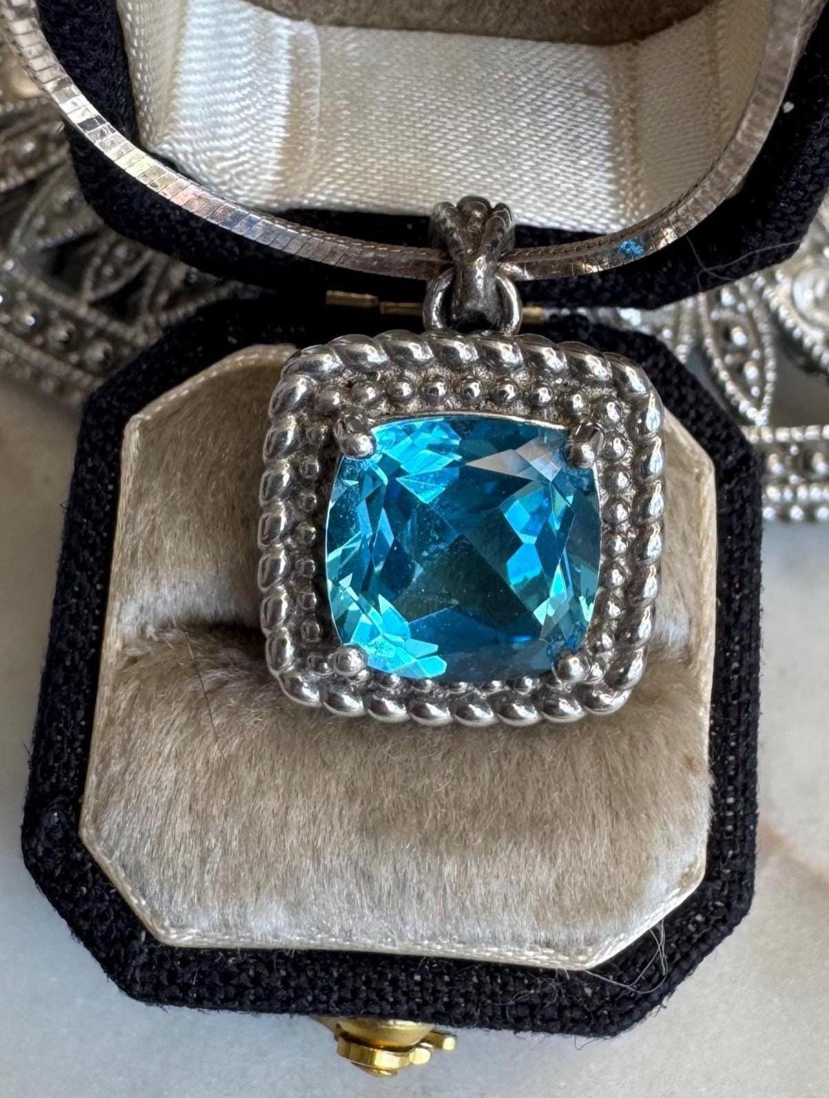 Sterling .925 Rhodium PlatedBlue Topaz Center StoneSnake chain 16in NEWSpring ring clasp8.53 gramsPre-owned NEW CHAINCondition excellent with minor surface wearBox shown not included, Beautifully packaged with 100% recycled material