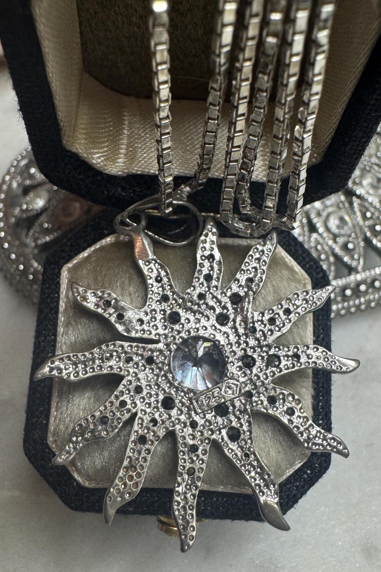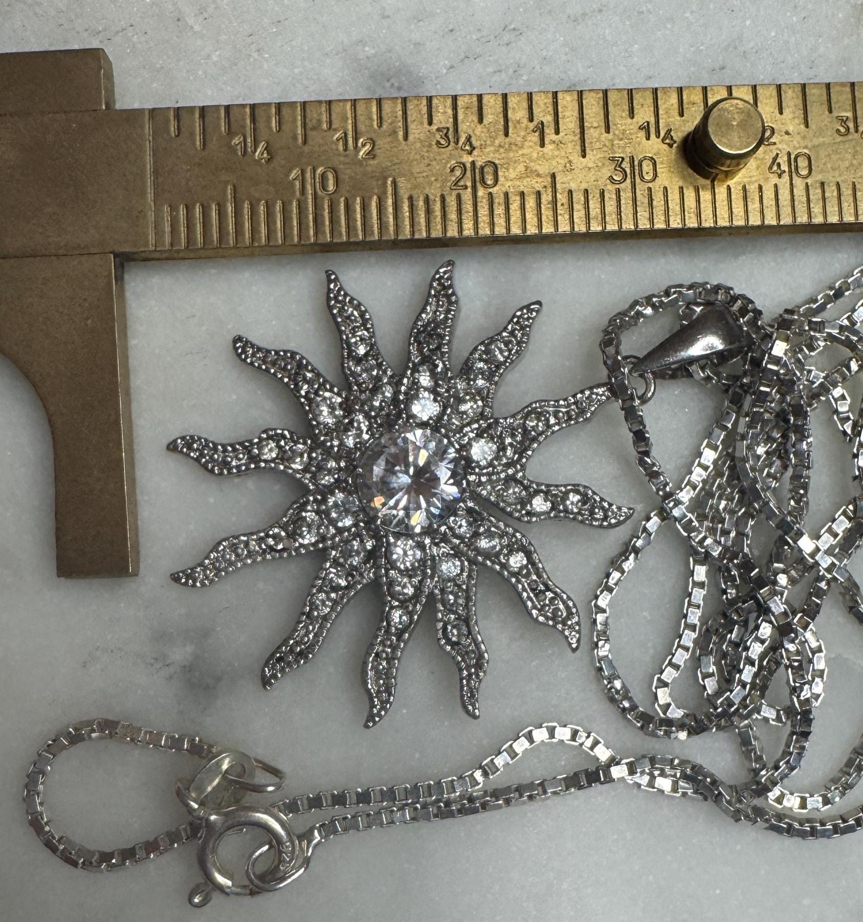 Sterling .925Sunburst Pendant Cubic Zirconia Center StonesBox link chain 22 1/2 in length8.95 gramsVintage, Pre-ownedCondition good with minor surface scratches-chain has minor kinksBox shown not included, Beautifully packaged
