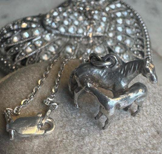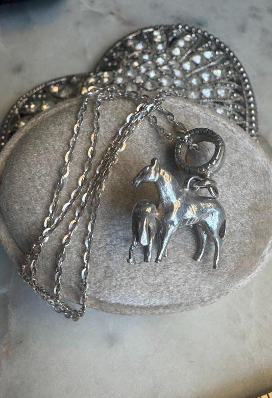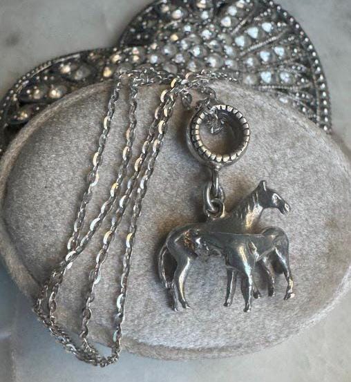 Sterling .925 Horse Pendant, Mother & Nursing PonyLink Chain 16inLobster claw clasp 6.74 gramsVintage Pre-ownedCondition good with minor surface wearBox shown not included, Beautifully packaged with 100% recycled material