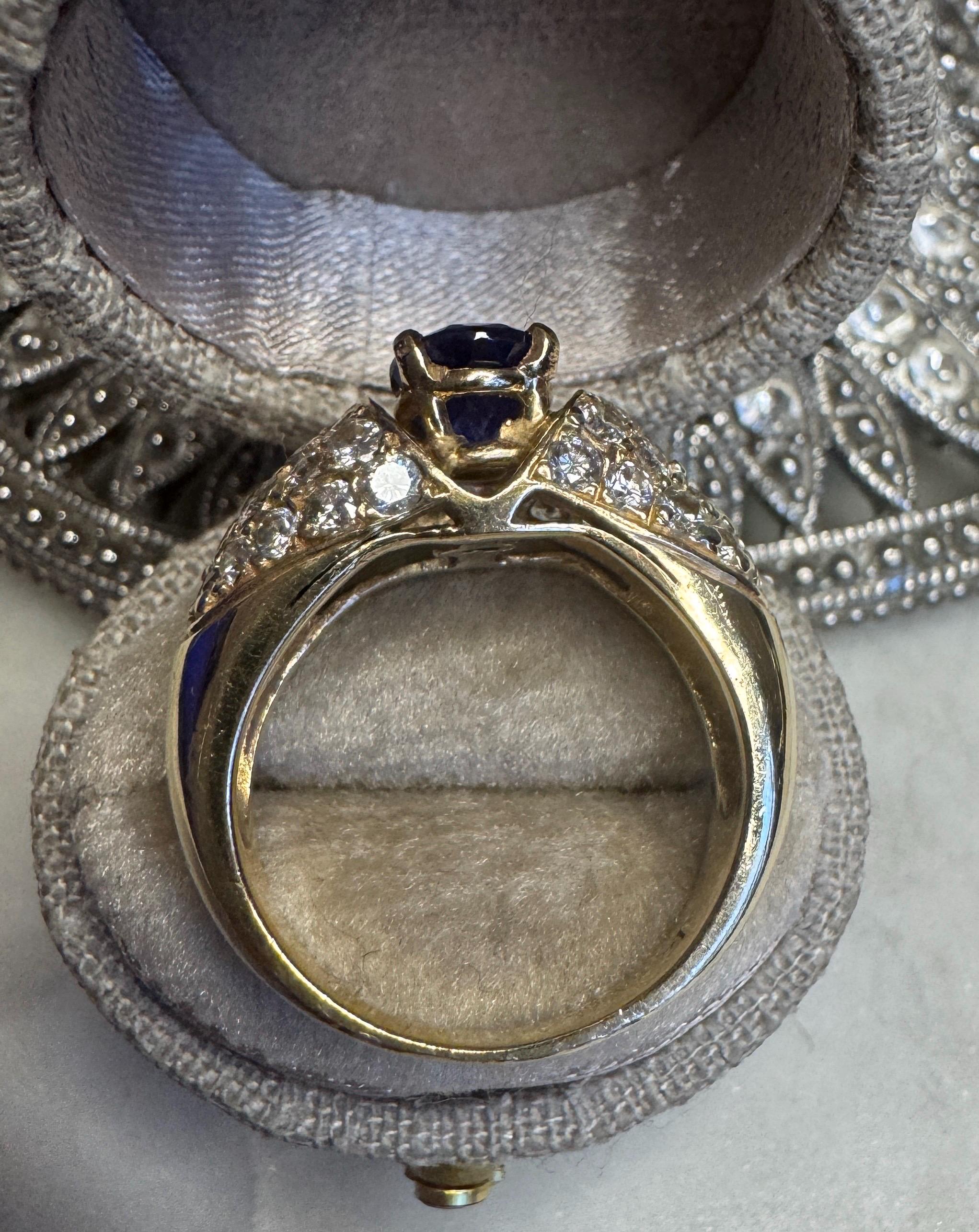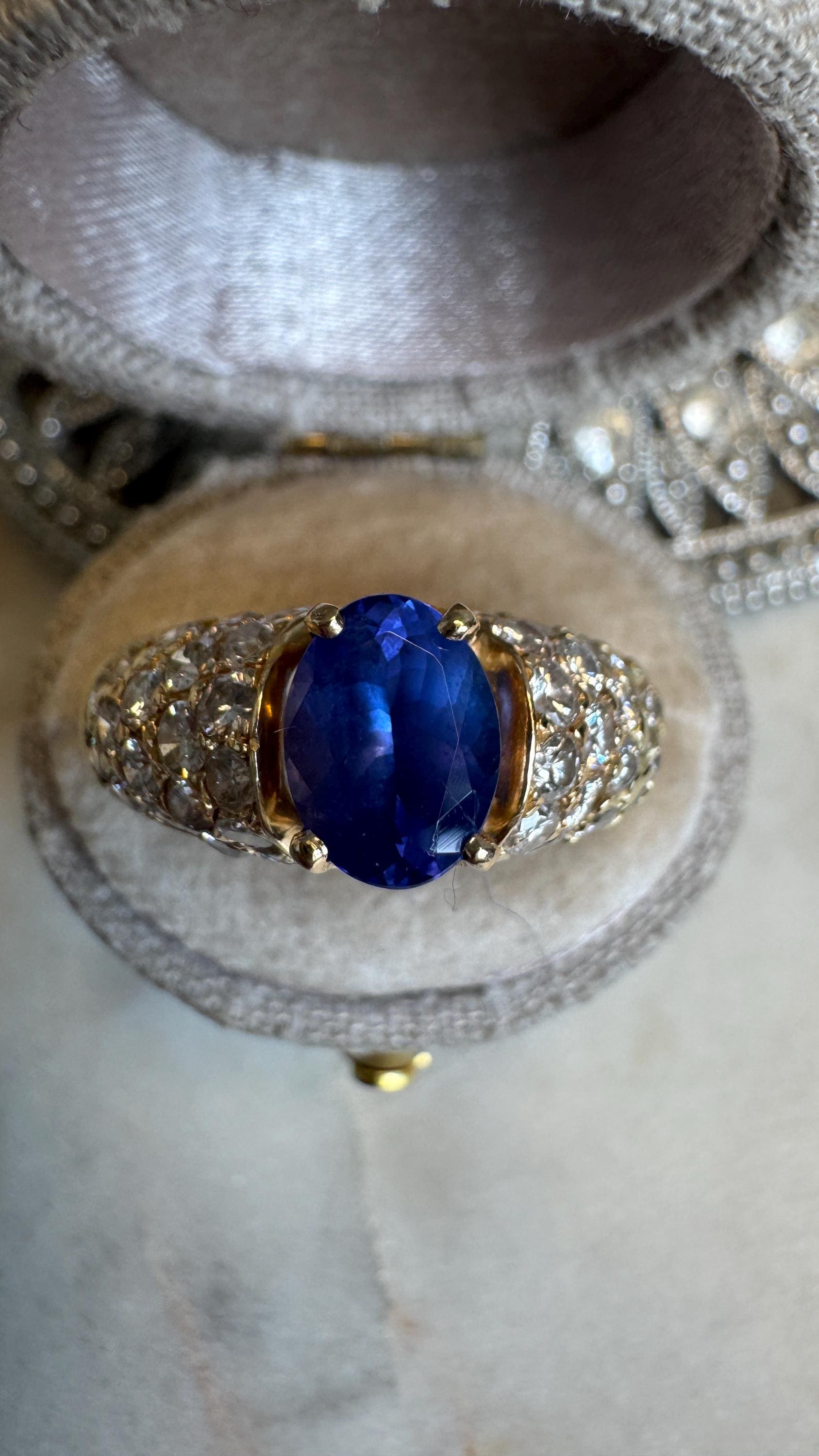 Yellow gold 14 ktTanzanite one carat ovalOne carat pave diamonds VS1 GH colorSize 66 gramsVintage preownedCondition excellent with minor surface wearBox shown not included, Beautifully packaged with 100% recycled material