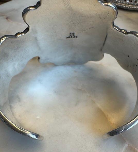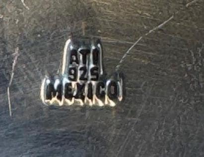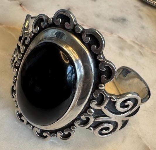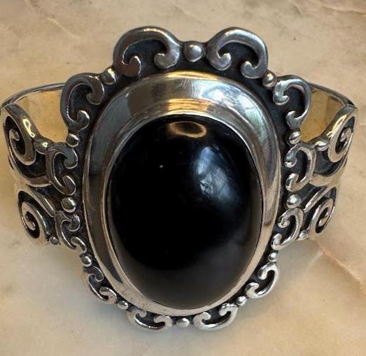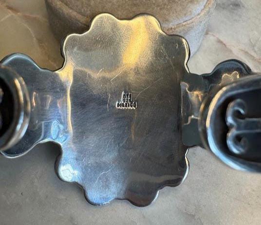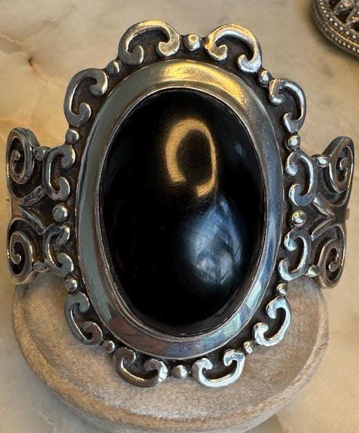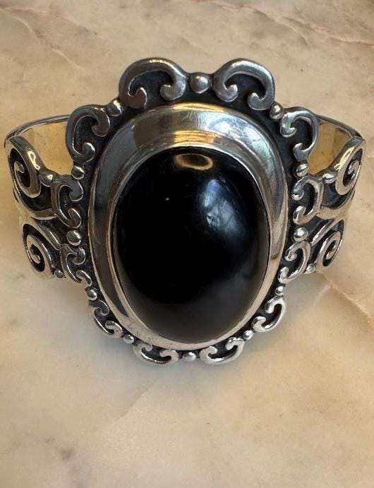 Sterling .925Black Onyx Center StoneMarked Mexico ATISlide-on Adjustable57 gramsVintage Pre-ownedCondition good with minor surface wearBox shown not included, Beautifully packaged with 100% recycled material