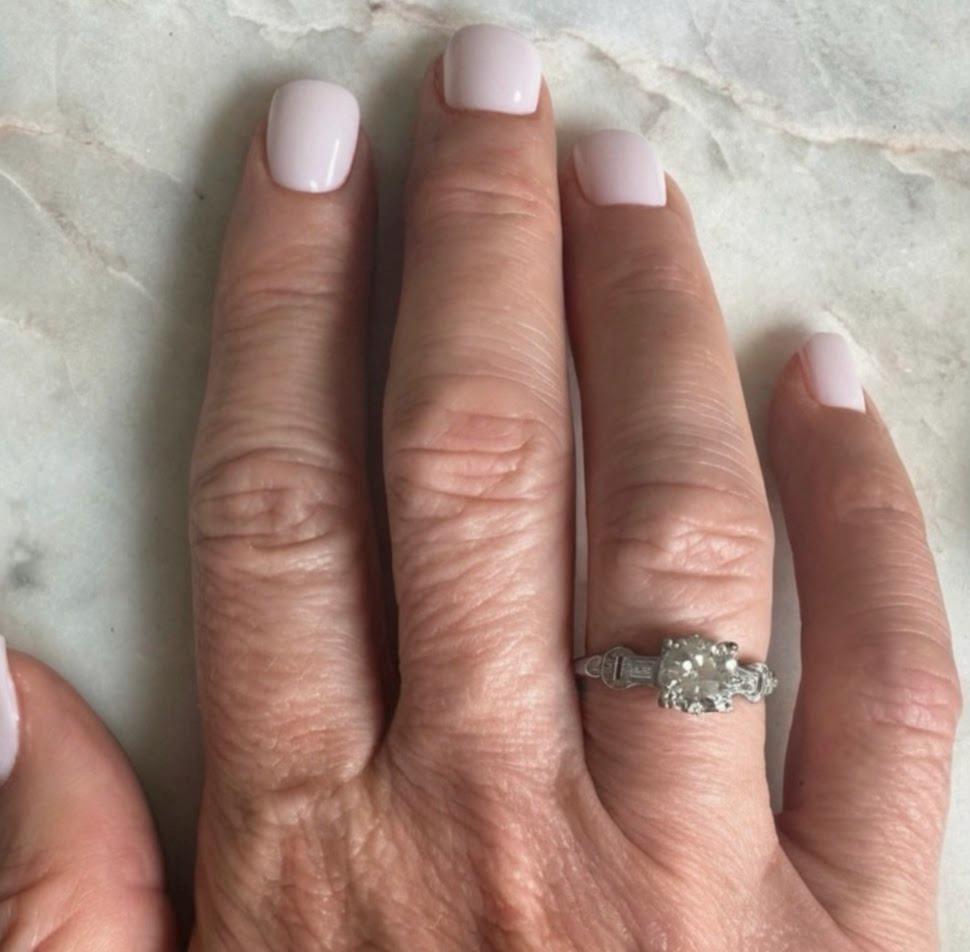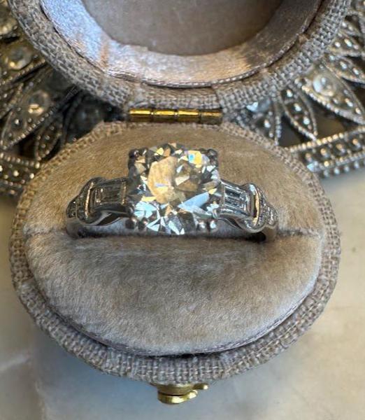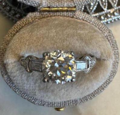 Platinum RingRound Brilliant Center 1.10 Baguette Accents .45VS1 clarity J/K Color3.07 gramsSize 7Vintage, Antique, Pre-ownedCondition good with minor surface wearBox shown not included, 100% Beautifully packaged with 100% recycled material