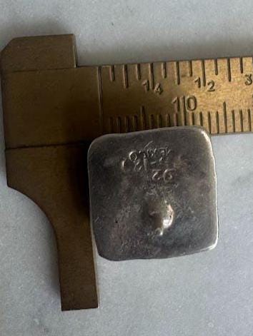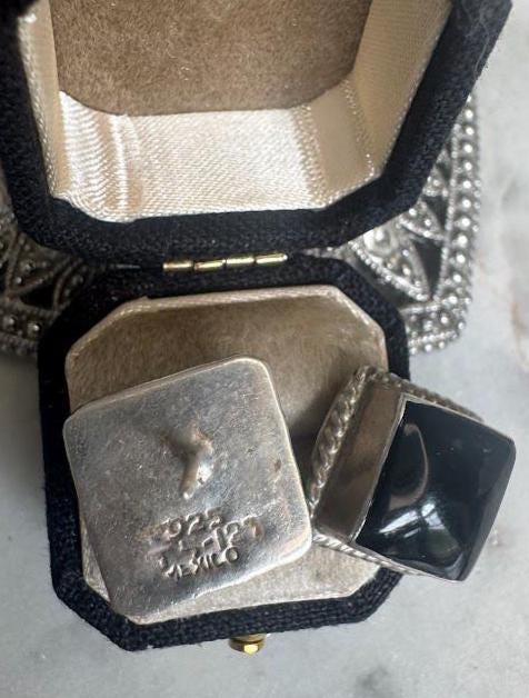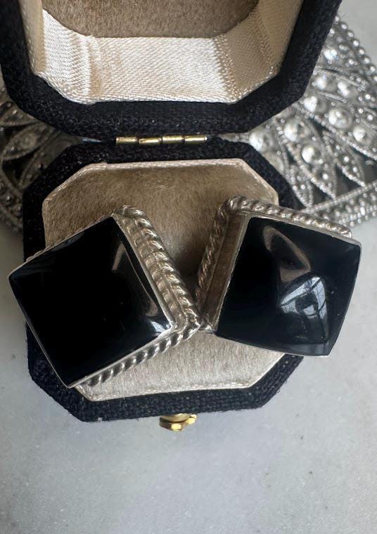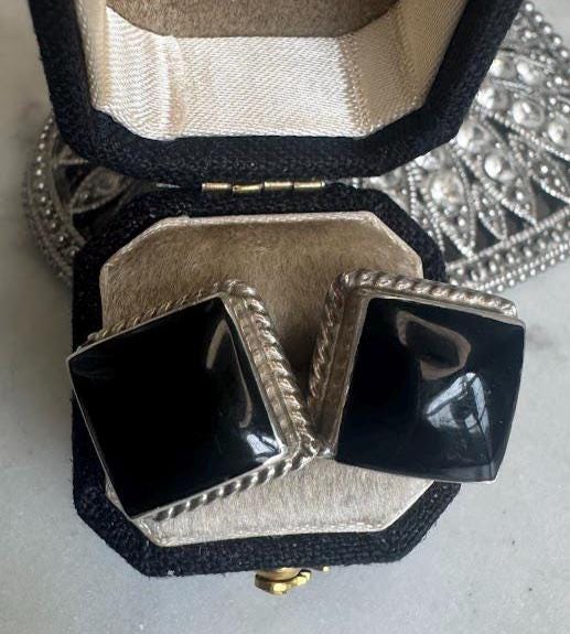 Sterling .925 Black Onyx Square Center Stone4 gramsPost pierced earringVintage, Pre-ownedCondition good with minor surface wearBox shown not included, Beautifully packaged with 100% recycled material