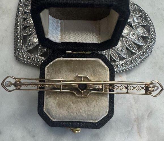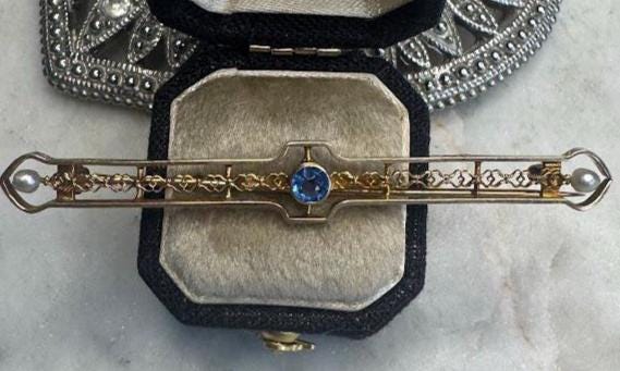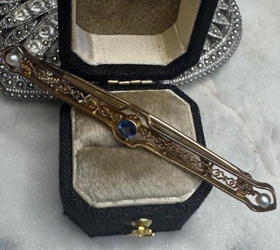 10 kt Yellow Gold Ceylon Sapphire & Seed Pearl Accents2.54 gramsVintage Pre-owned Condition good with minor surface wearBox shown not included, Beautifully packaged with 100% recycled materials