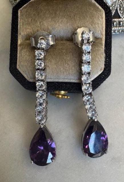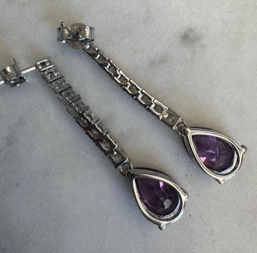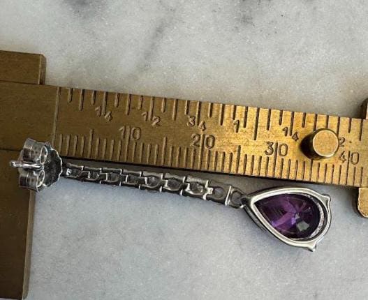 Sterling .925 Amethyst Pear Shaped Center Stones 10mmCubic Zirconia Accent StonesPost pierced earring5.85 gramsLike New Pre-owned Condition excellent with little wearBox shown not included, Beautifully packaged with 100% recycled material