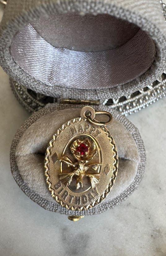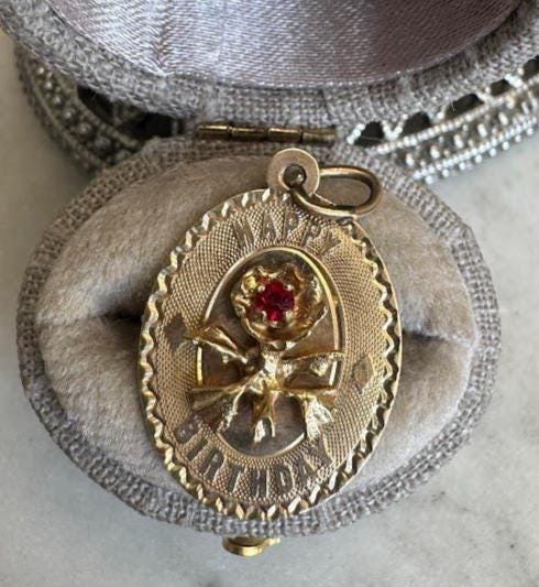 14 kt yellow gold Happy Birthday Ruby Charm1.48 gramsVintage Pre-ownedCondition Good with minor surface wearOriginal jump ring includedBox shown not included, Beautifully packaged with 100% recycled material