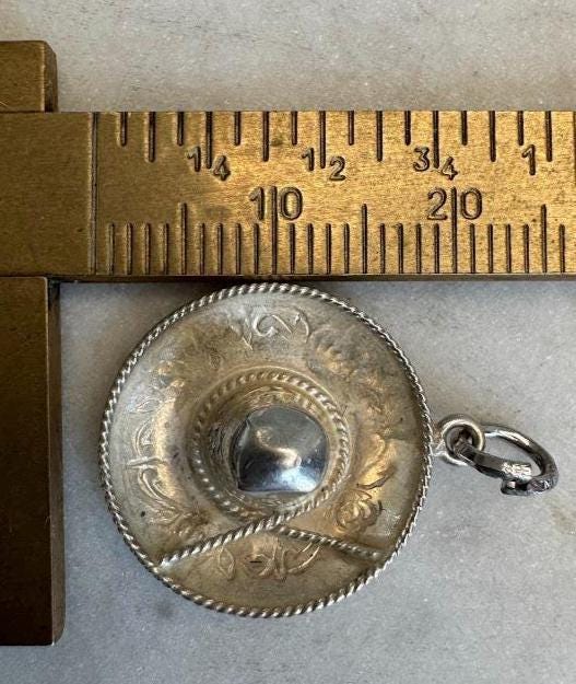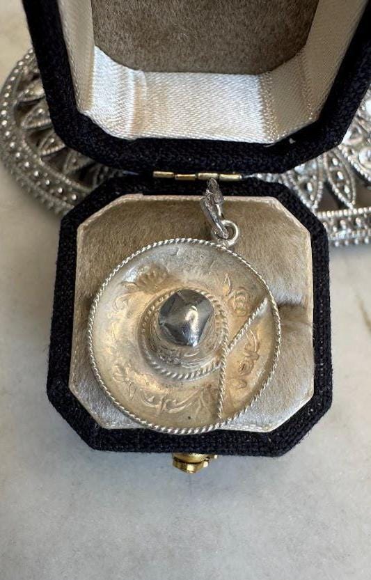 Sterling .925Mexican Silver Sombrero Charm PendantDesigner Stamped GC-011.89 gramsVintage, pre-ownedCondition excellent with minor surface wearBox shown not included, Beautifully packaged with 100% recycled material