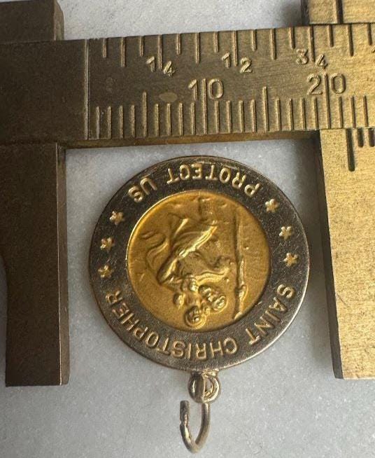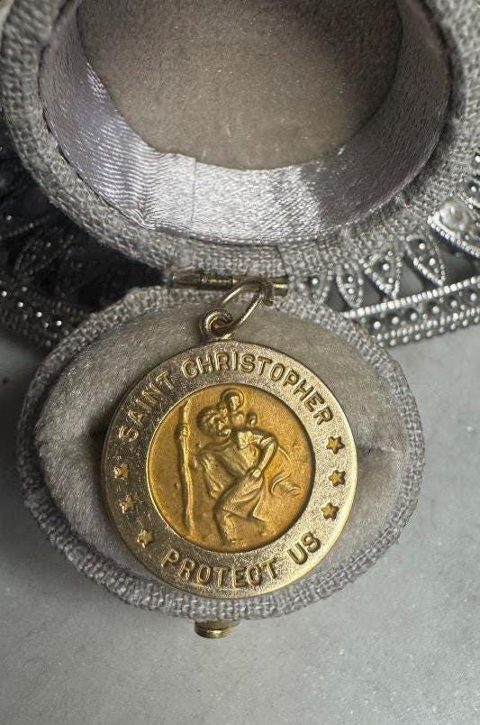 14 kt Yellow GoldSt. Christopher Charm Pendant2.36 gramsVintage Pre-owned Condition good with minor surface wearBox shown not included, Beautifully packaged with 100% recycled material