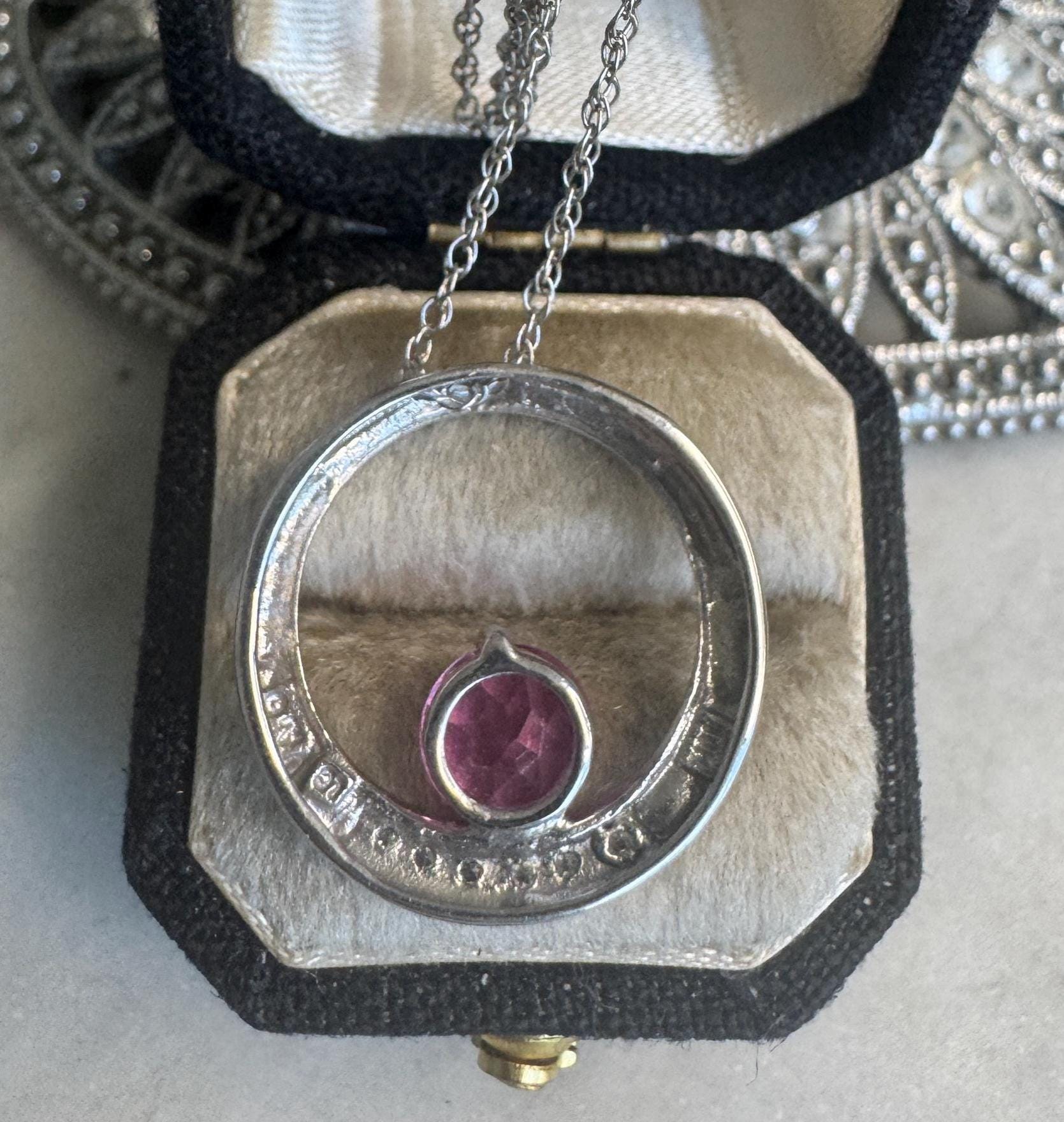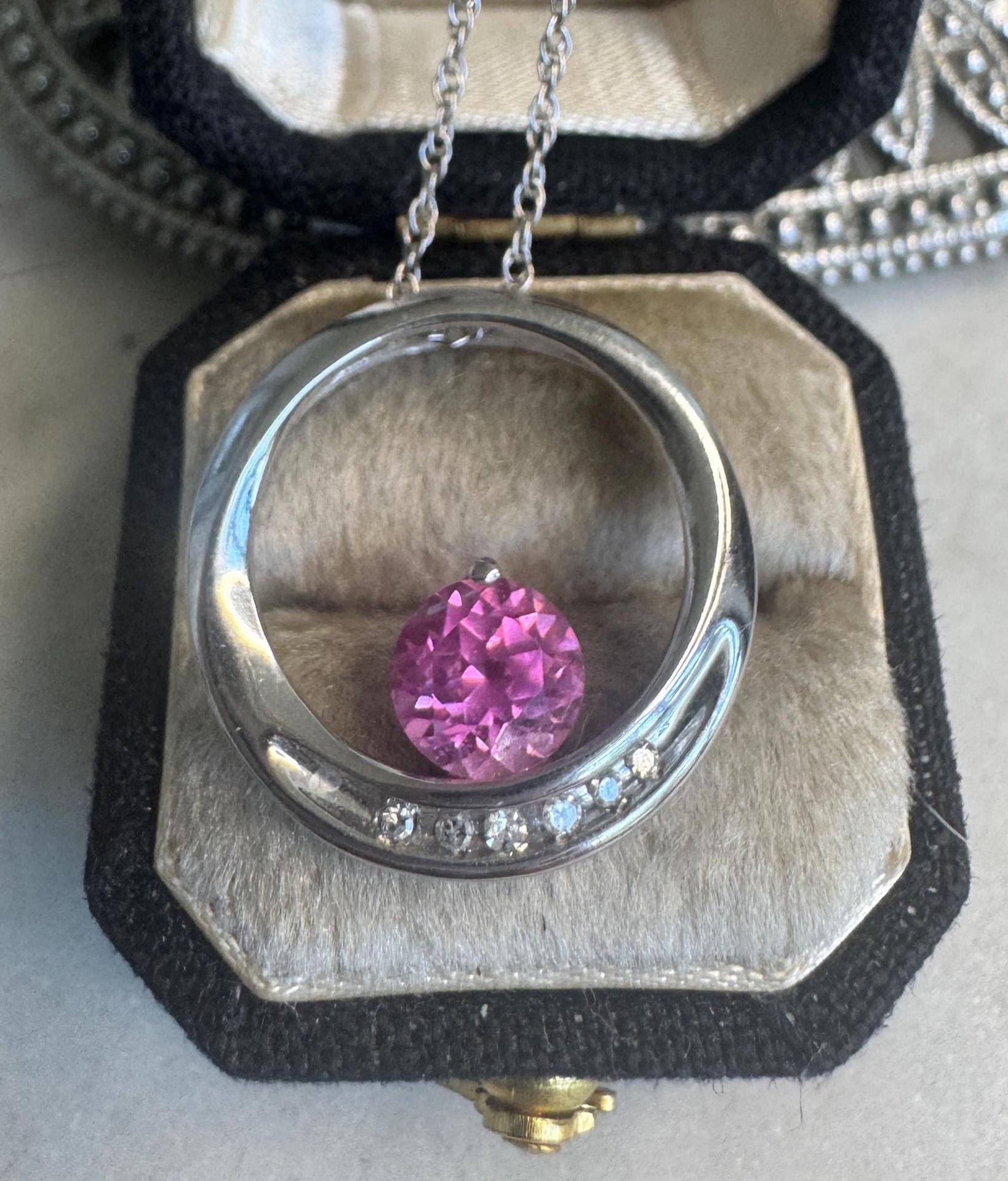 White gold 14kt & 10kt PendantPink Sapphire Half Carat Round Center Stone2.25 gramsCable link chain 18 in lengthSpring ring claspCondition excellent with minor surface wearBox shown not included, Beautifully packaged with 100 recycled material