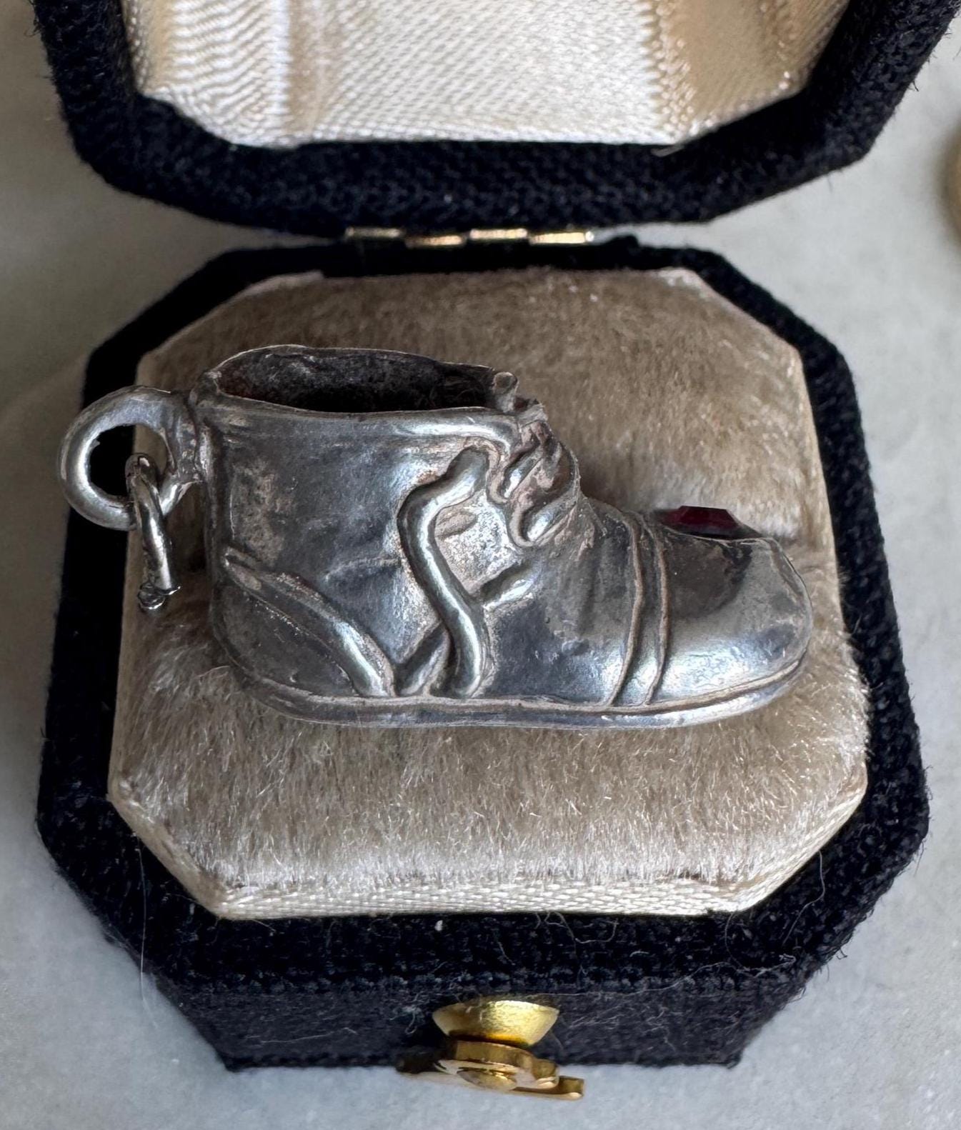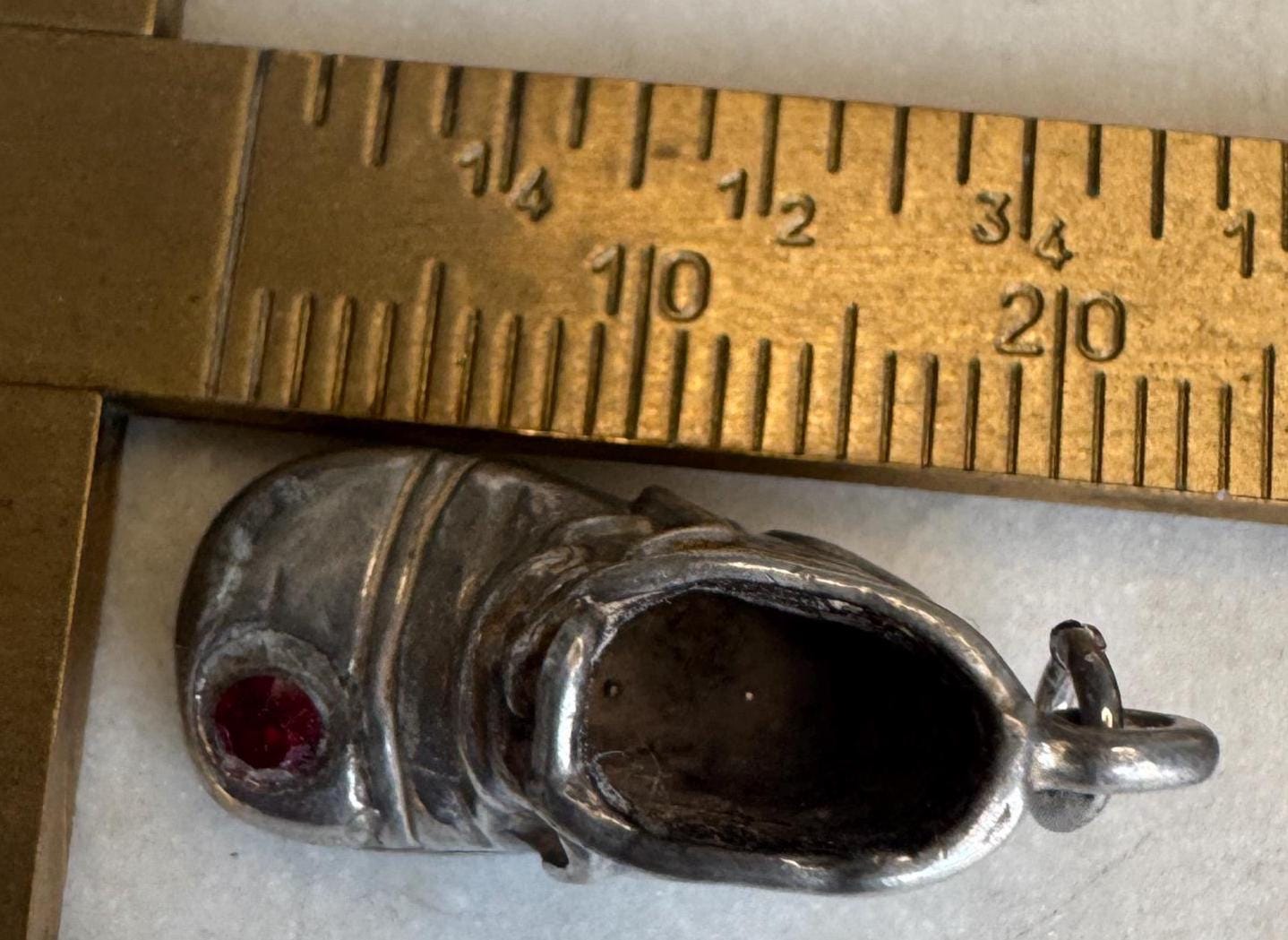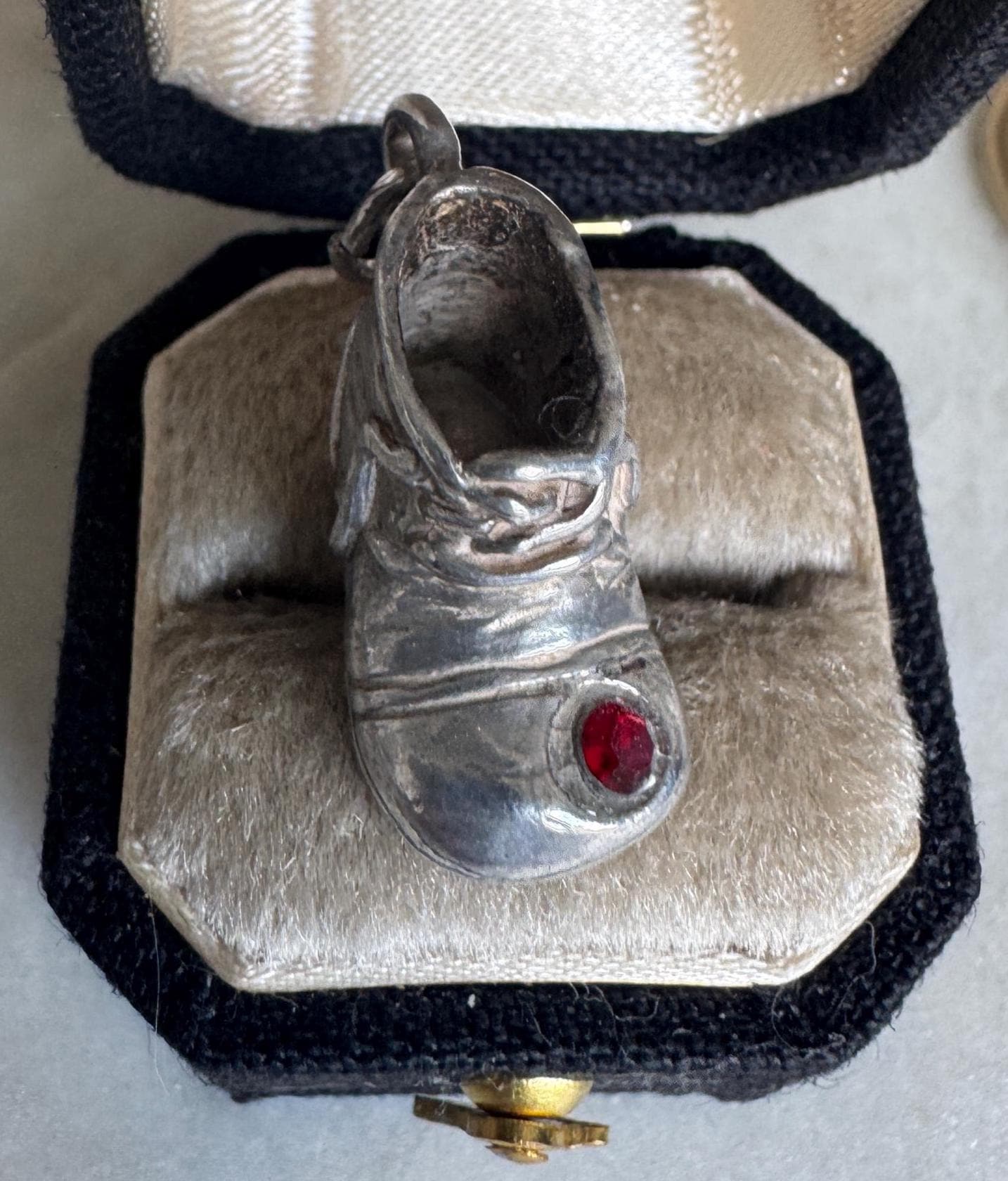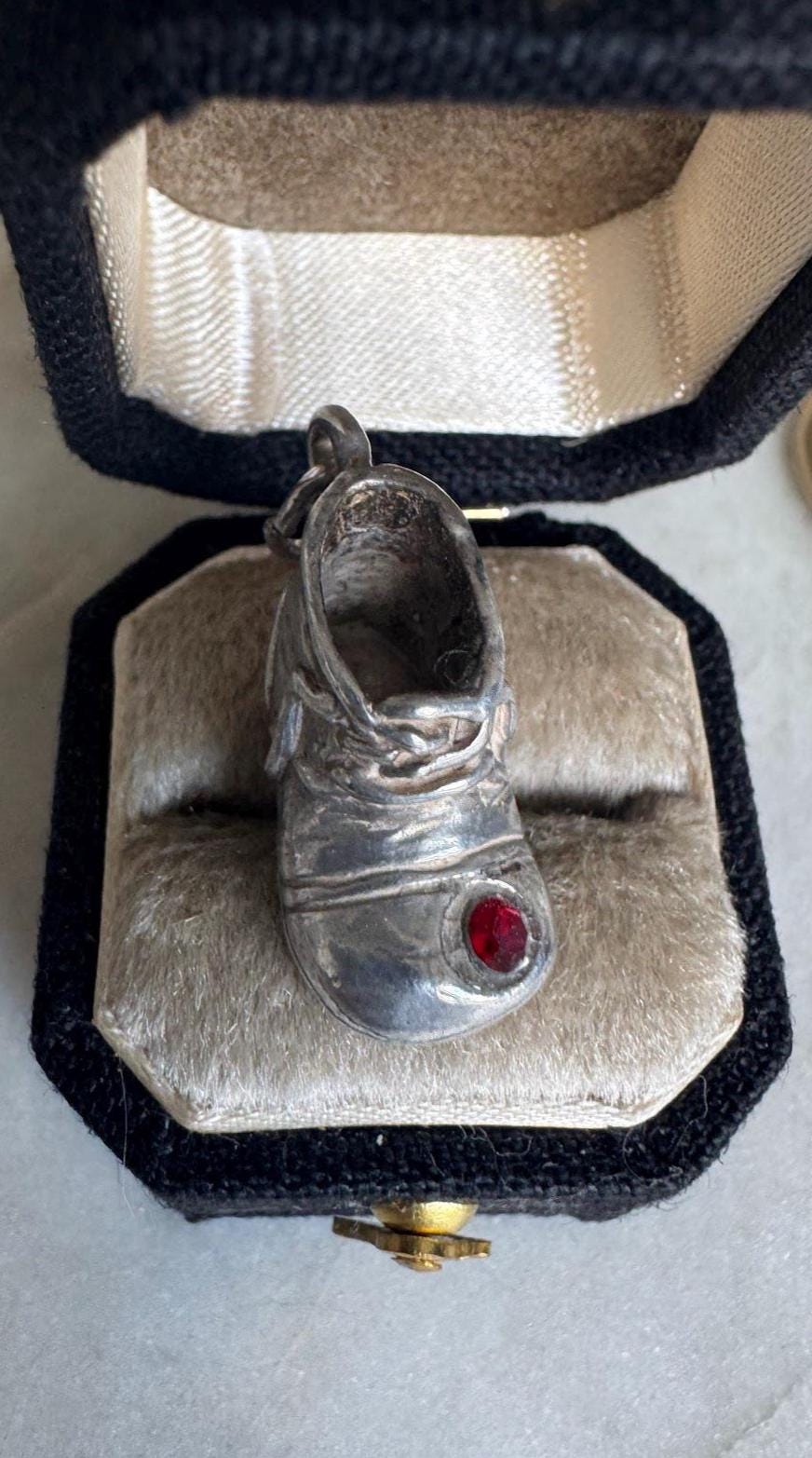 Sterling .925Baby Shoe Synthetic Ruby Charm2 gramsVintage Pre-ownedCondition good with minor surface wearBox shown not included, Nicely packaged with 100% recycled material