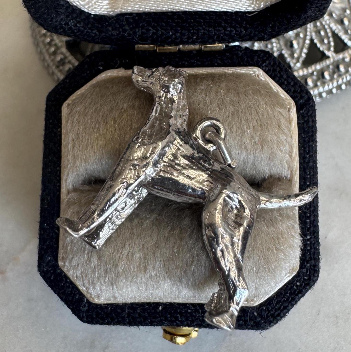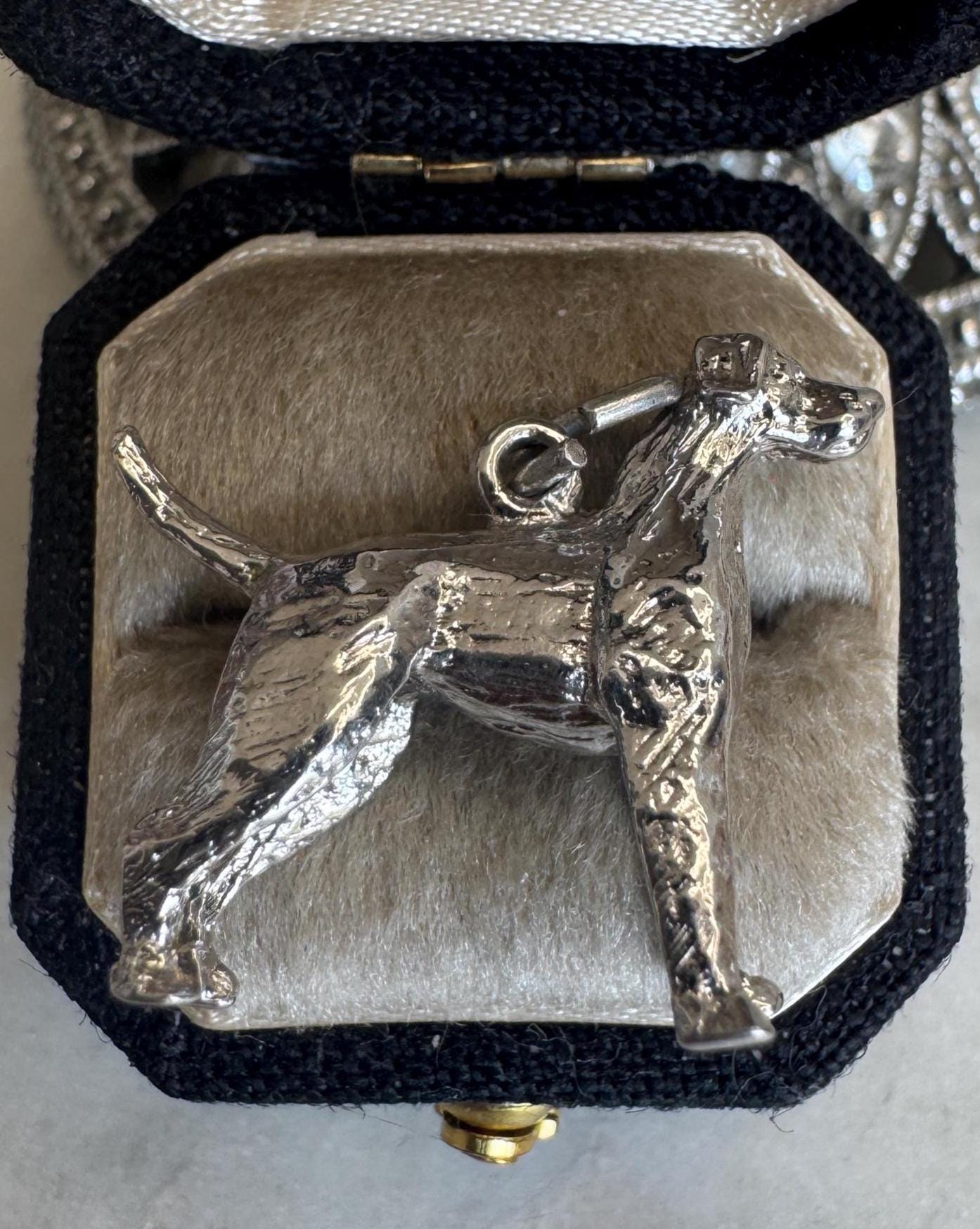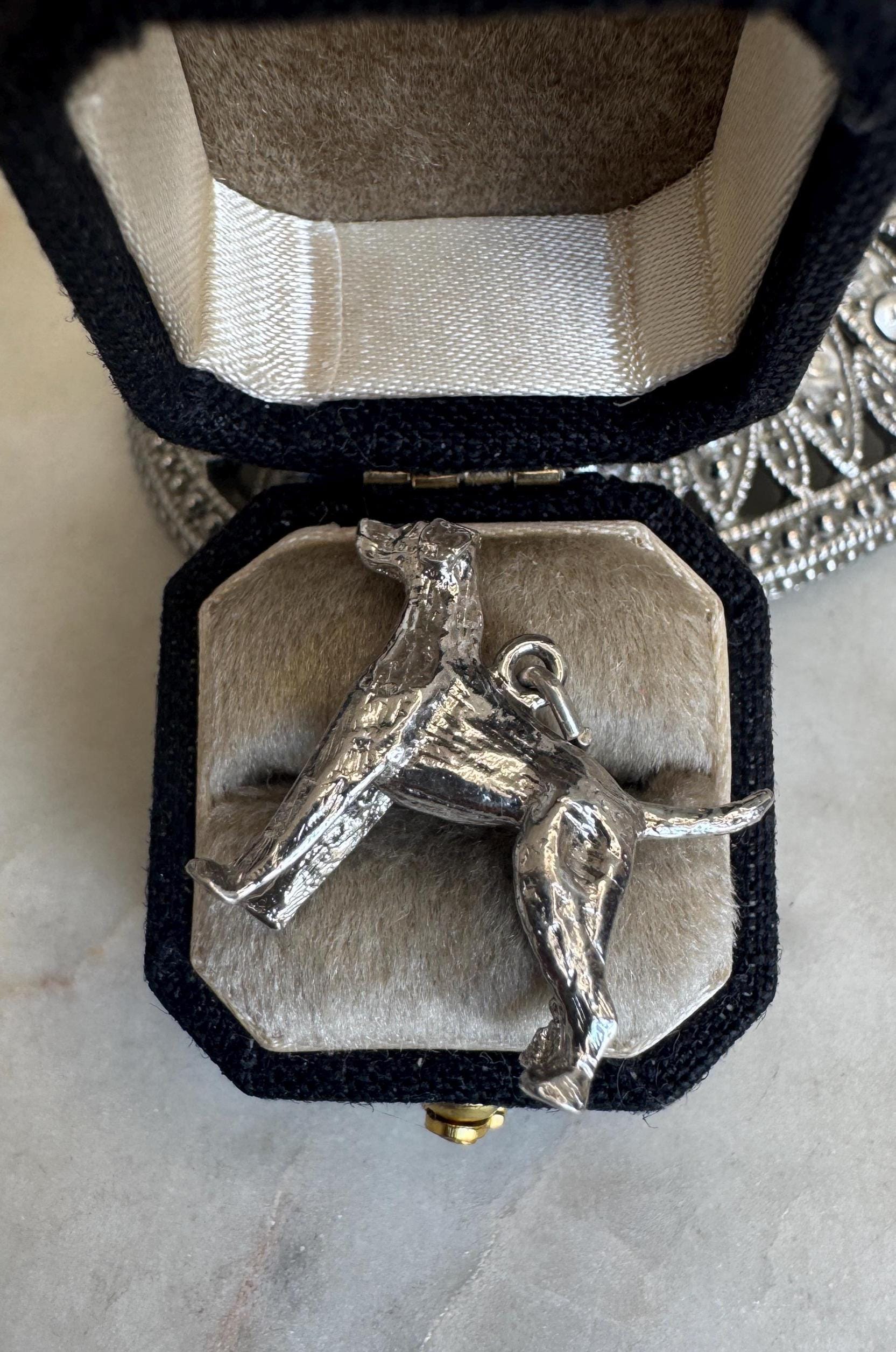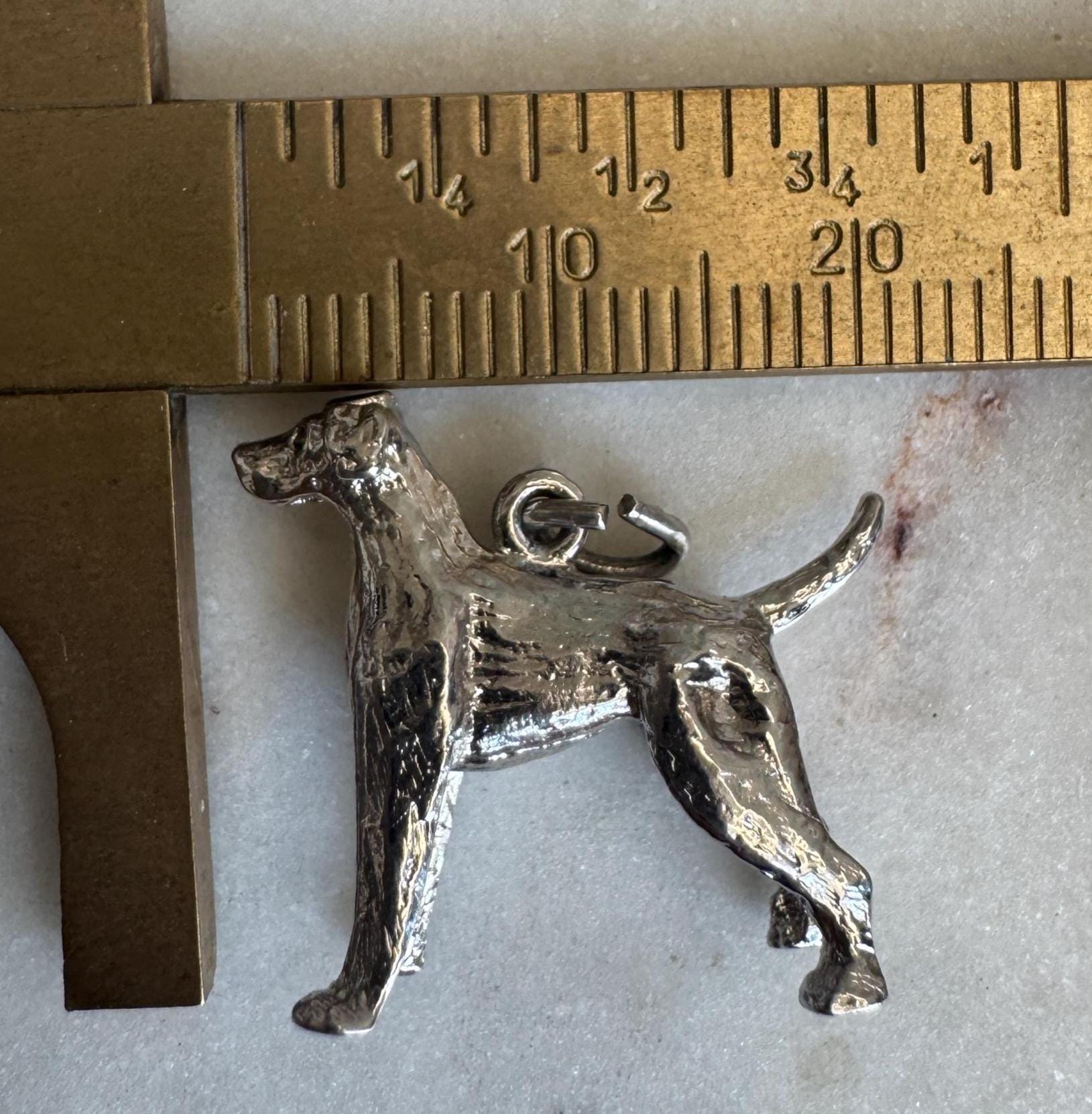 Sterling .925Dog Golden Retriever Charm Pendant4.77 gramsRhodium platedVintage Pre-ownedCondition good with minor surface wearBox shown not included, Nicely packaged with 100% recycled material
