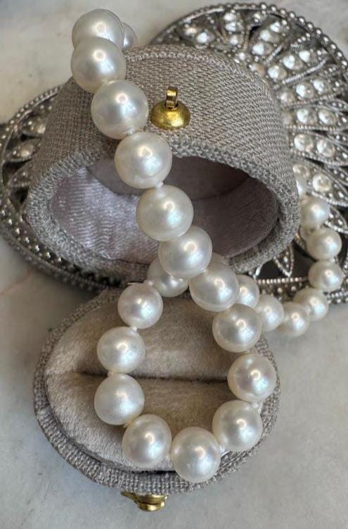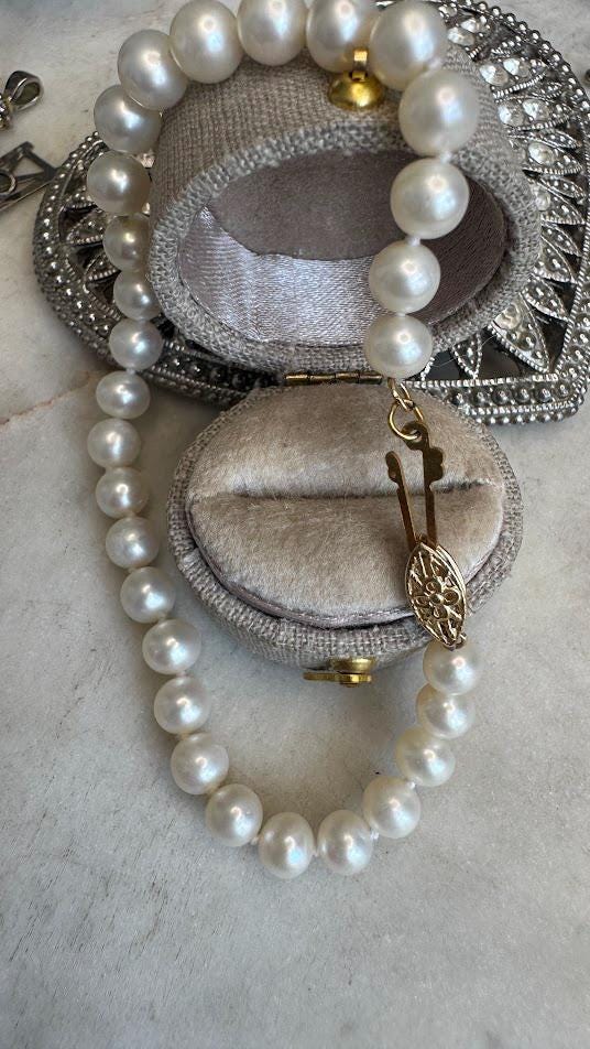 Gold 14kt Clasp Pearl 4mm Bracelet7in length Fish hook clasp7.74 gramsPre-ownedCondition excellent with minor surface wearBox shown not included, Nicely packaged with 100% recycled material