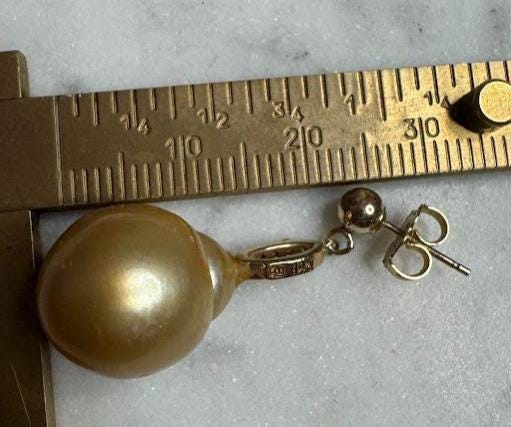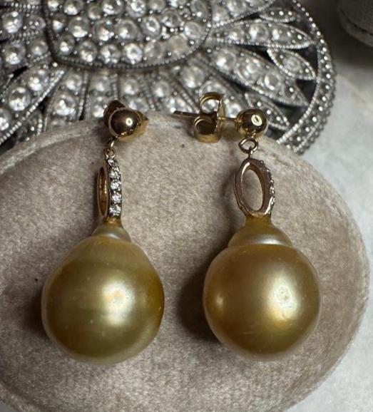 14 kt Yellow GoldSouth Sea Pearl Earrings 12 mm LIKE NEWDiamond Accent .20 carats total weight7.42 gramsPre-ownedCondition like new