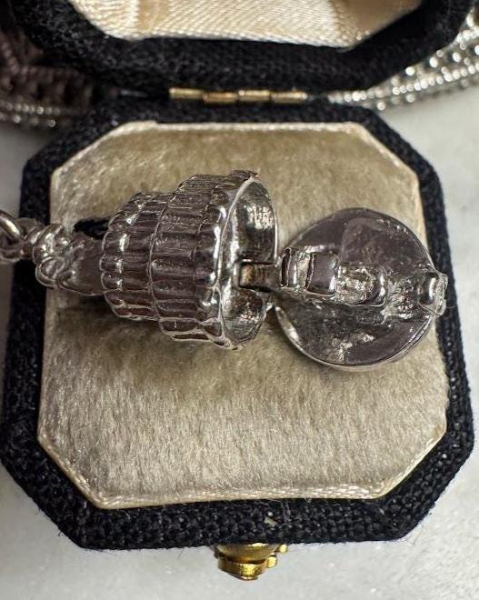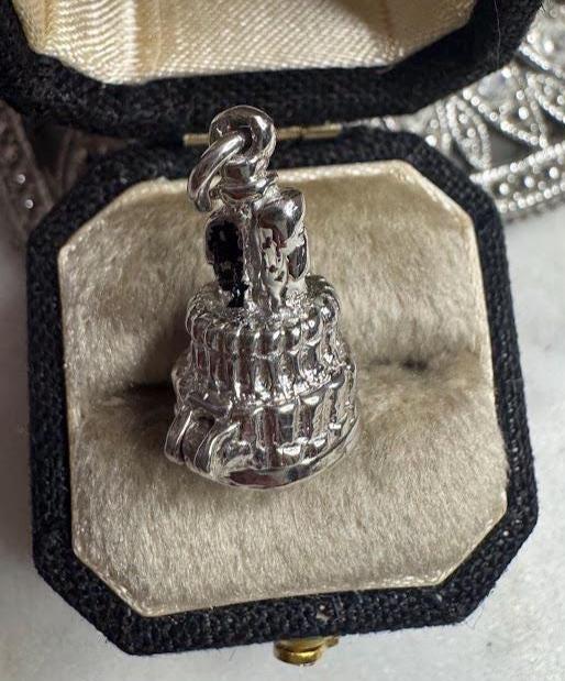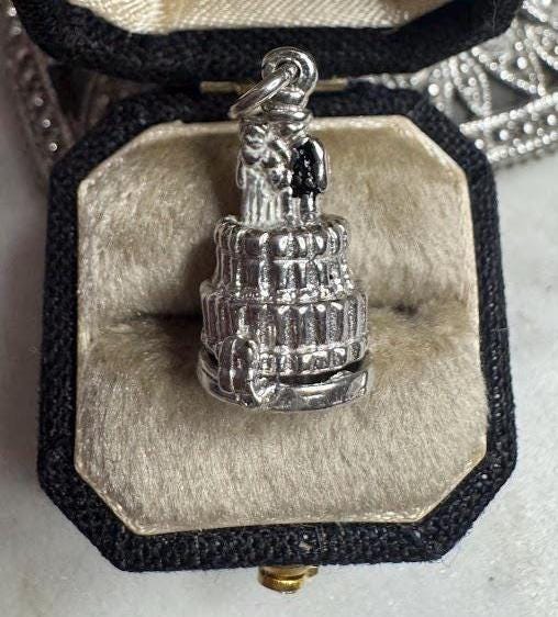 Sterling .925Bride & Groom Wedding Cake Baby Carriage Charm3.55 gramsVintage Pre-owned Rhodium platedCondition excellent with minor surface wearBox shown not included, Nicely packaged with 100% recycled material