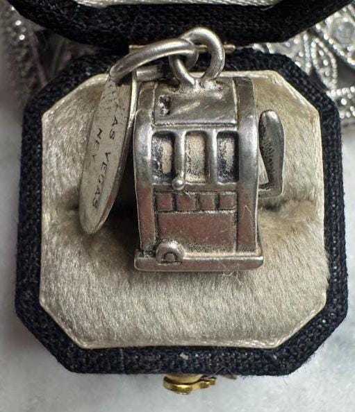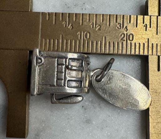 Sterling .925Las Vegas Slot Machine Charm4.19 gramsVintage Pre-ownedCondition good with minor surface wearBox shown not included, Nicely packaged with 100% recycled material
