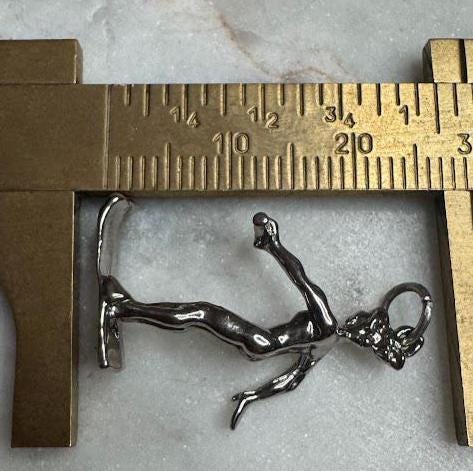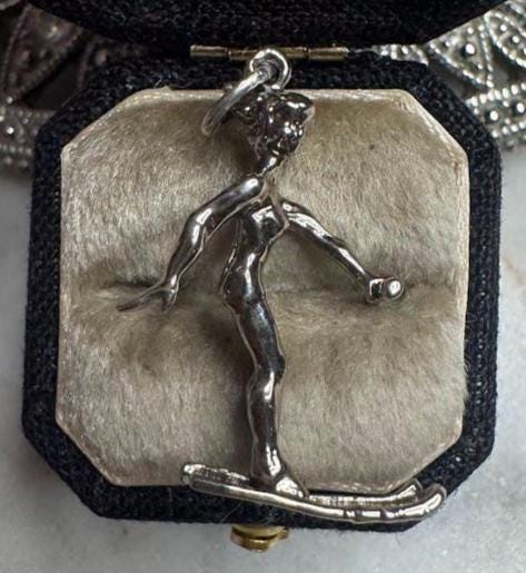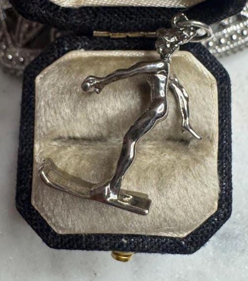 Sterling .925Lady Water Skier Charm2.17 gramsVintage Pre-owned Rhodium PlatedCondition good with minor surface wearBox shown not included, Nicely packaged with 100% recycled material