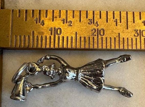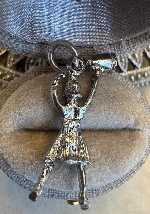 Sterling silver .925 Cheerleader with Megaphone Charm Rhodium plated2 gramsVintage Pre-ownedCondition excellent with minor surface wearBox shown not included, Nicely packaged with 100% recycled material