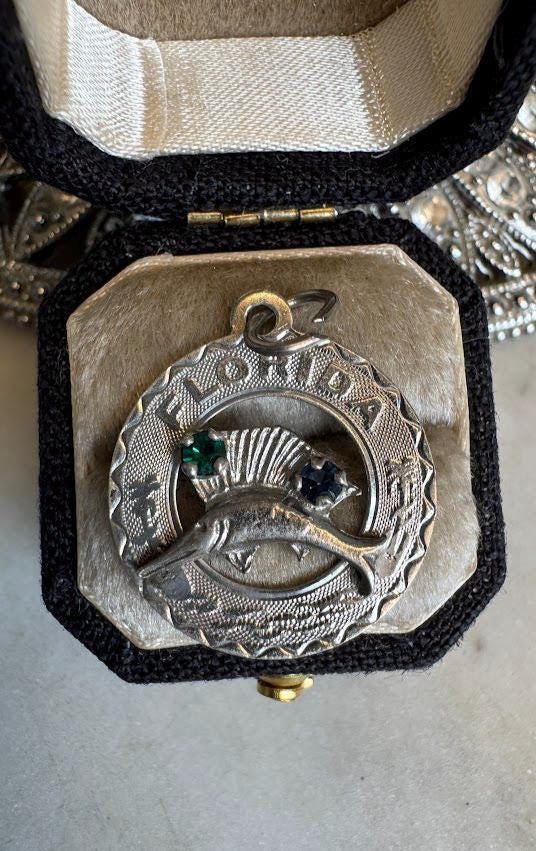 Sterling .925 Florida Sword Fish Charm Pendant1.60 gramsVintage Pre-ownedCondition excellent with minor surface wearBox shown not included, Nicely packaged with 100% recycled material