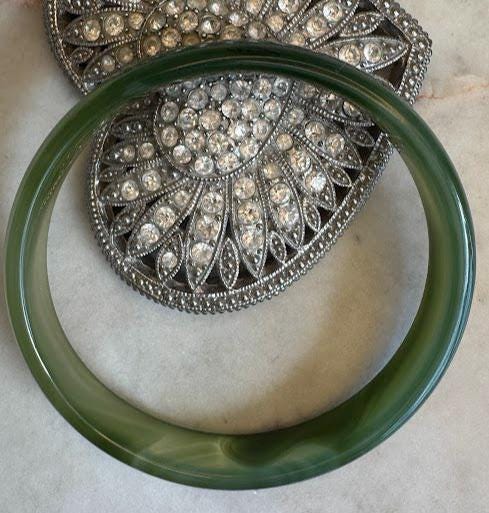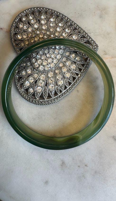 Sterling .925Jade Stone Bangle3 in diameter15 gramsVintage Pre-owned Condition excellent with minor surface wearBox shown not included, Nicely packaged with 100% recycled material