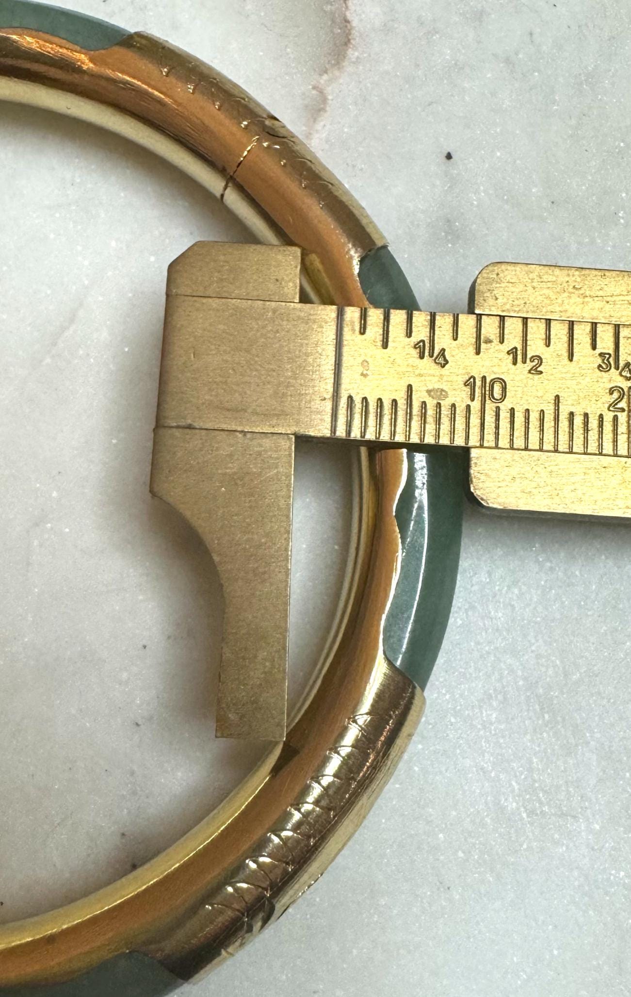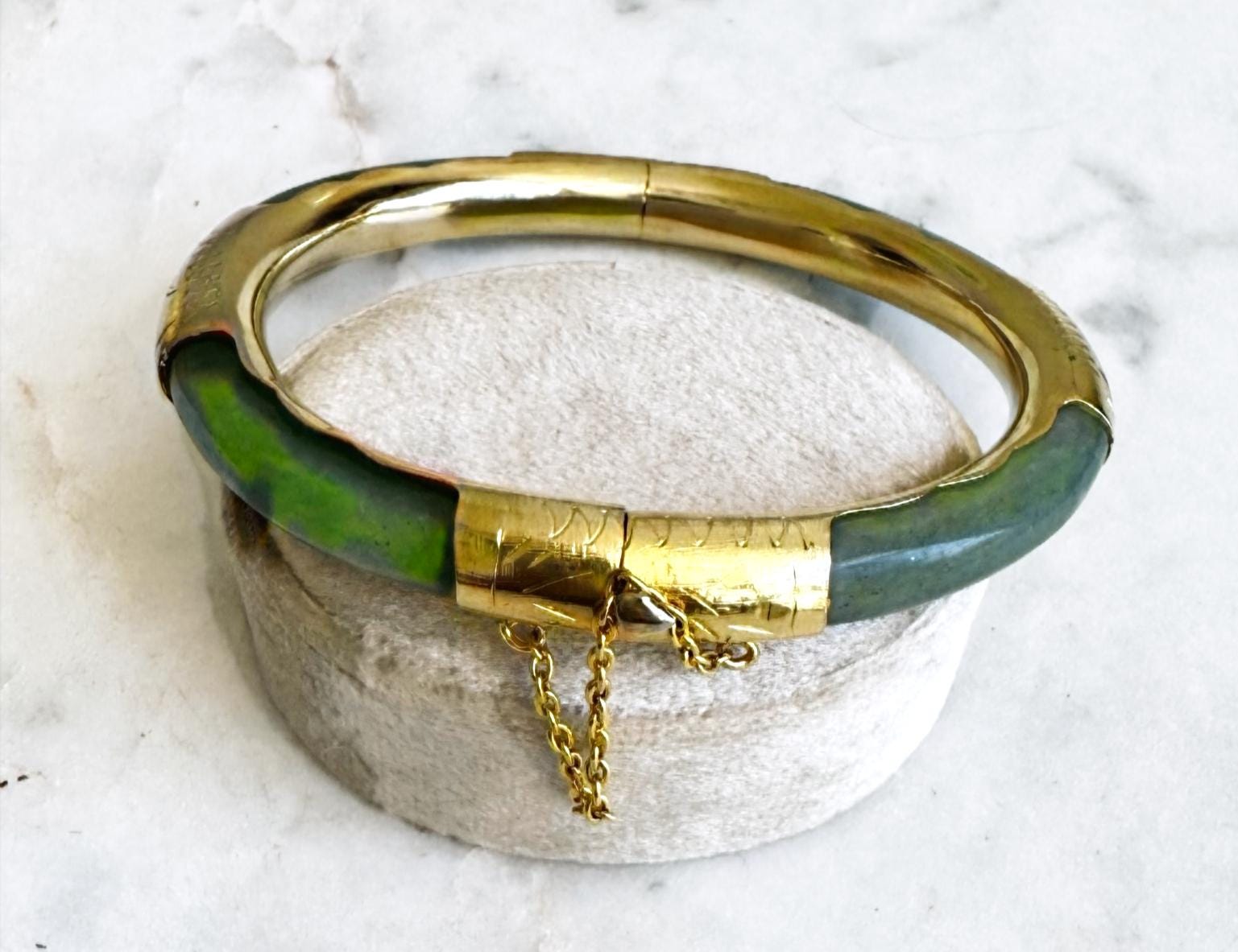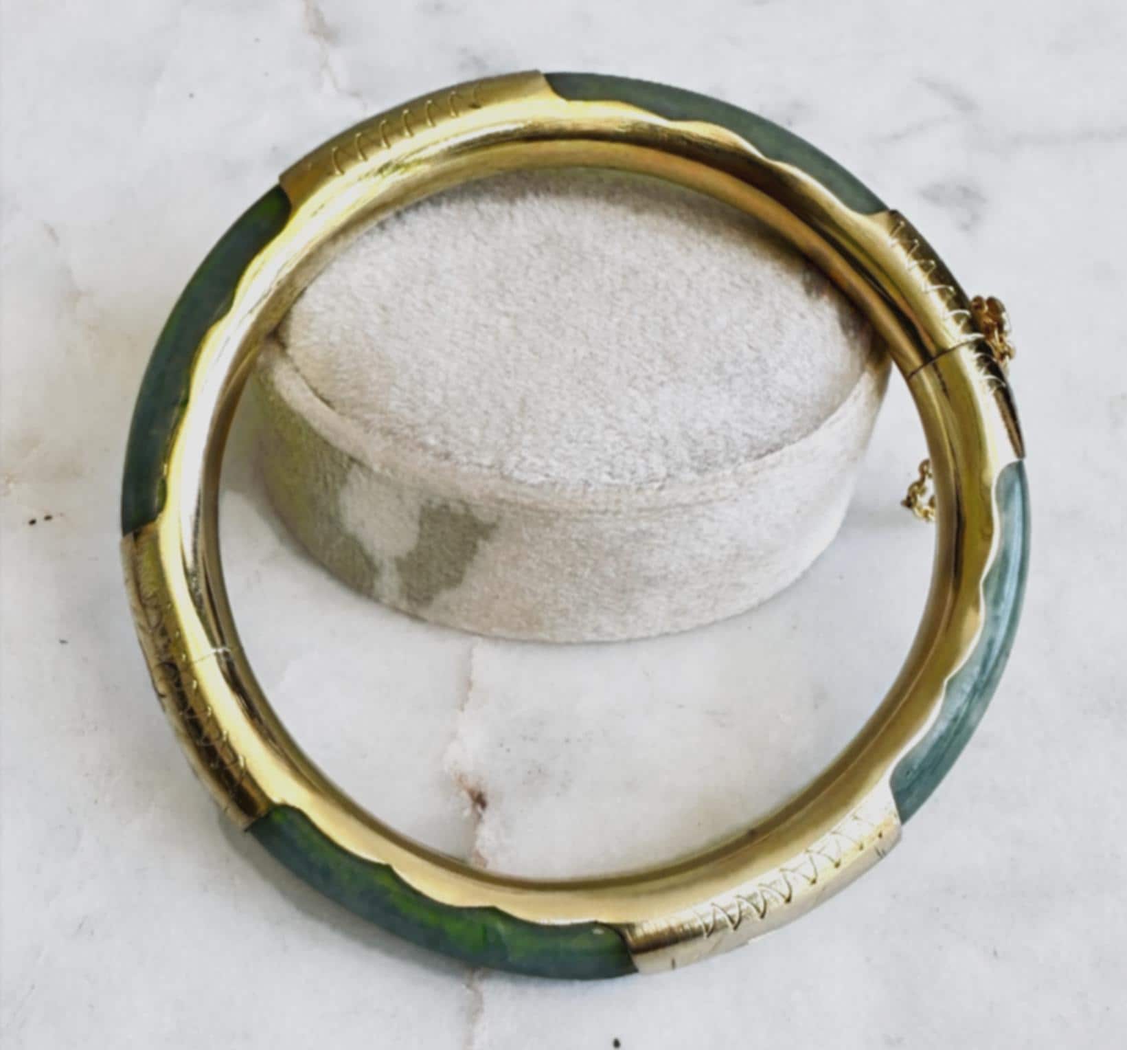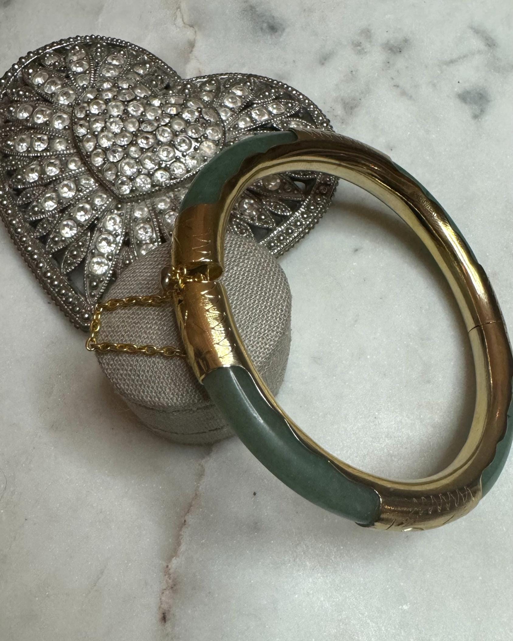 Sterling .925Jade Stone Bangle3 in diameterPlunge clasp with safety chain25.93 gramsVintage Pre-owned Condition excellent with minor surface wearBox shown not included, Nicely packaged with 100% recycled material