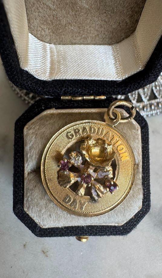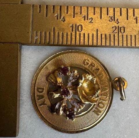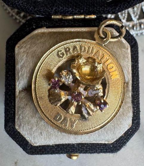 14kt Yellow GoldGraduation Day Ruby Charm with three Rubies2.07 gramsVintage Pre-owned Condition Excellent with minor surface wearBox shown not included, Beautifully packaged with 100% recycled material