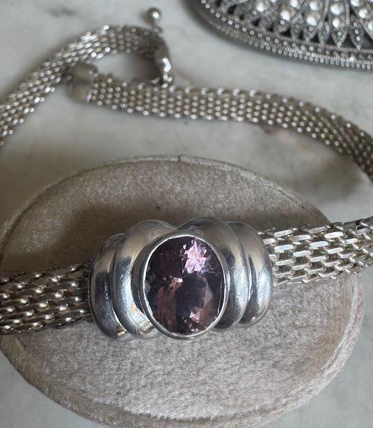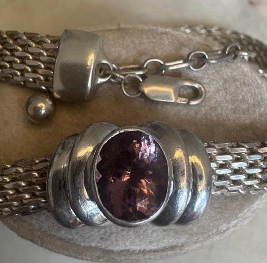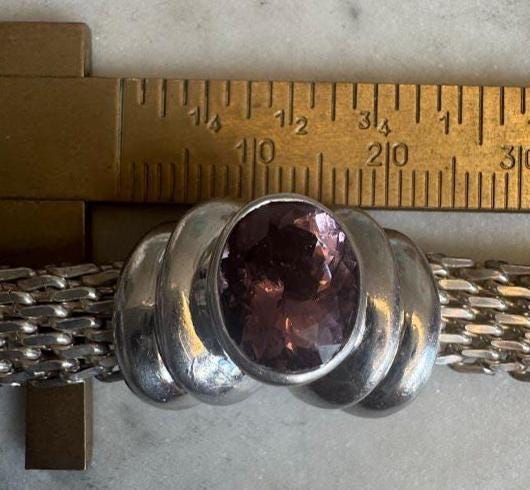 Sterling .925 Amethyst Center StoneWeave-like chain 15in & 2.5in extenderLobster claw clasp47.18 gramsVintage Pre-owned Condition excellent with minor surface wearBox shown not included, Nicely packaged with 100% recycled material