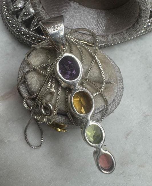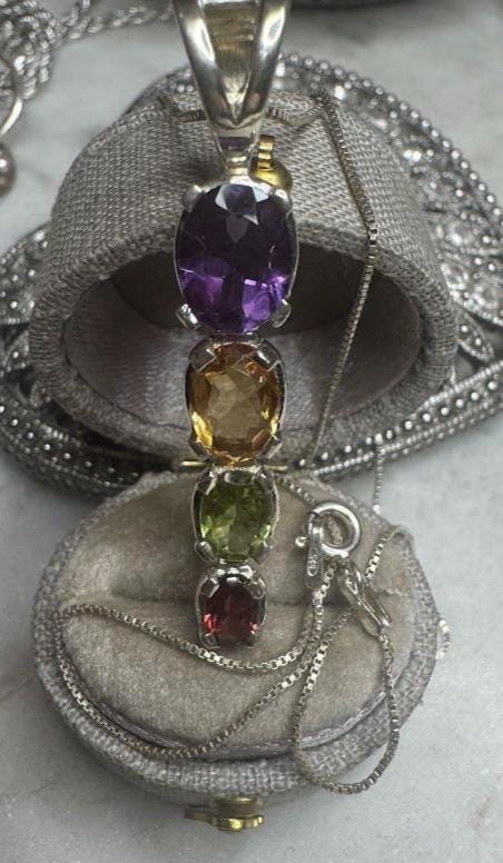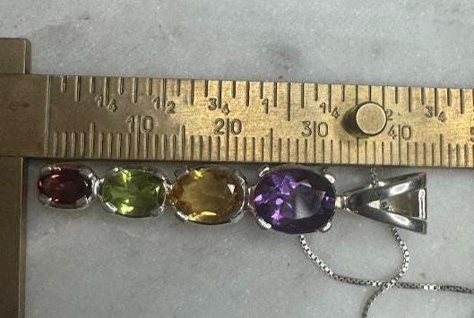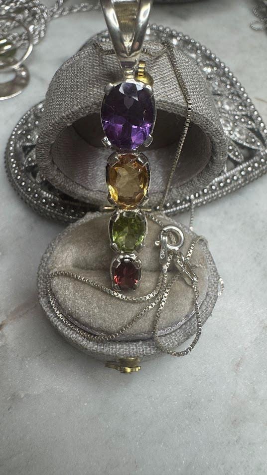 Sterling .925 Garnet, Citrine, Peridot, Amethyst Accent StonesBox Chain 18 inSpring Ring Clasp5.66 gramsVintage, Pre-owned Condition good with minor surface wearNicely Packaged