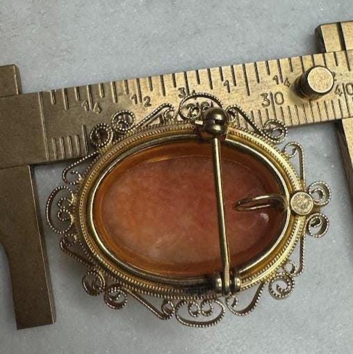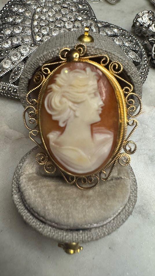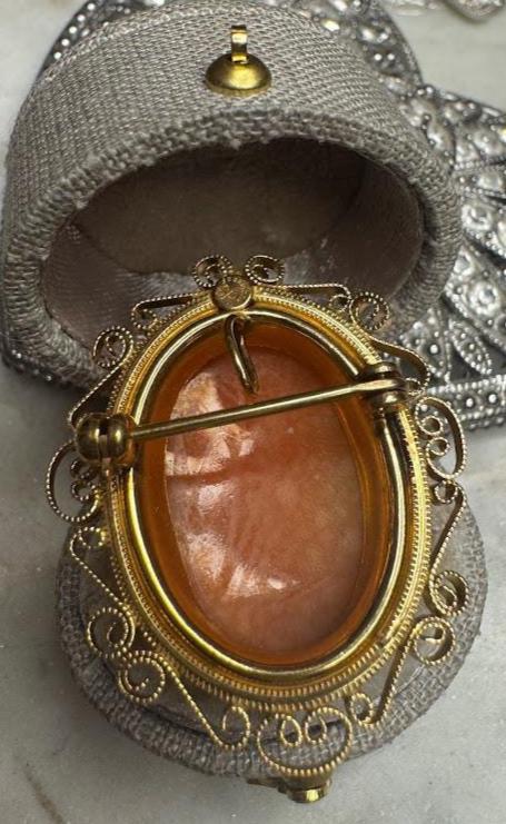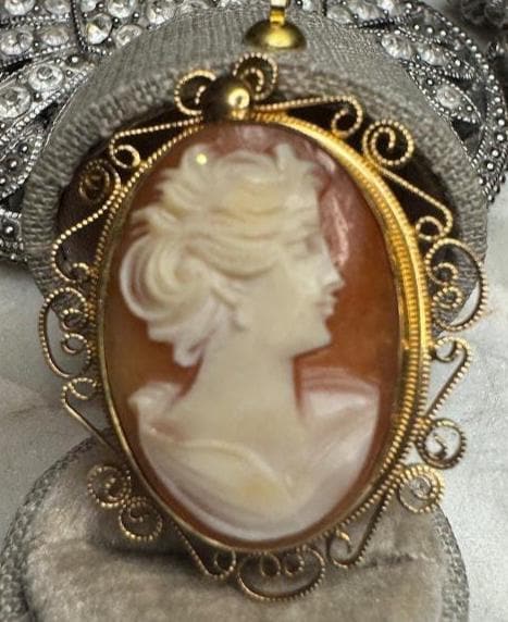 Sterling .925 Cameo Carved Shell Lady Brooch1/20 18kt Gold Filled (superior to gold plated)4.68 gramsVintage Pre-owned Condition good with minor surface wearBox shown not included, Beautifully packaged with 100% recycled material