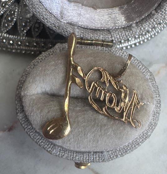14 kt Yellow GoldDainty Music Note & Mom Charm Pendants.88 GramsVintage Pre-owned Condition good with minor surface wearBox shown not included, Packaged nicely with 100% recycled material