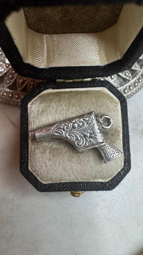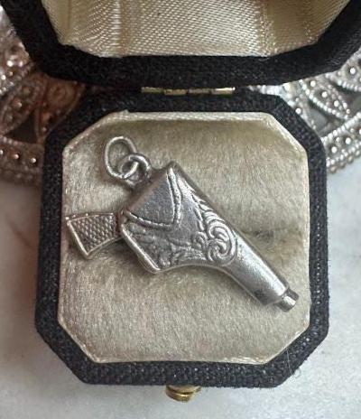 Sterling .925 Antique Pistol Charm 3.05 gramsVintage Pre-ownedCondition excellent with minor surface wearBox shown not included, Nicely packaged with 100% recycled material