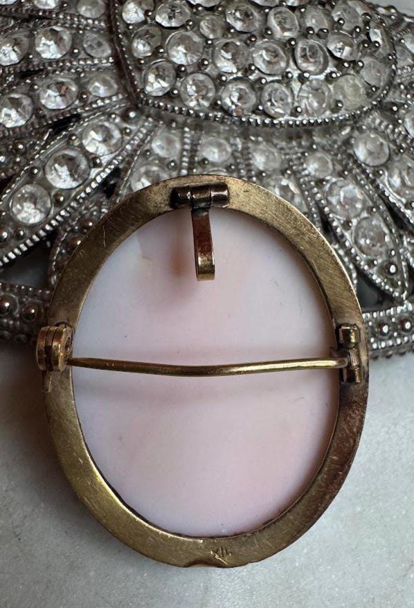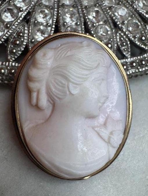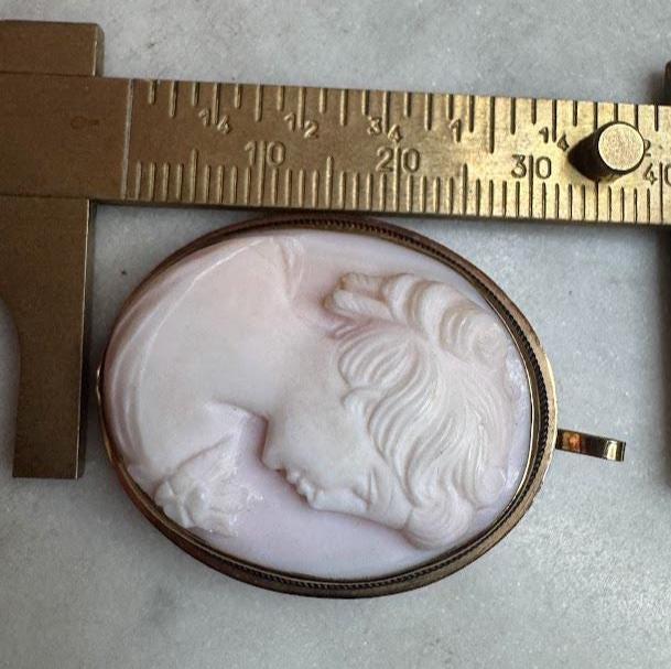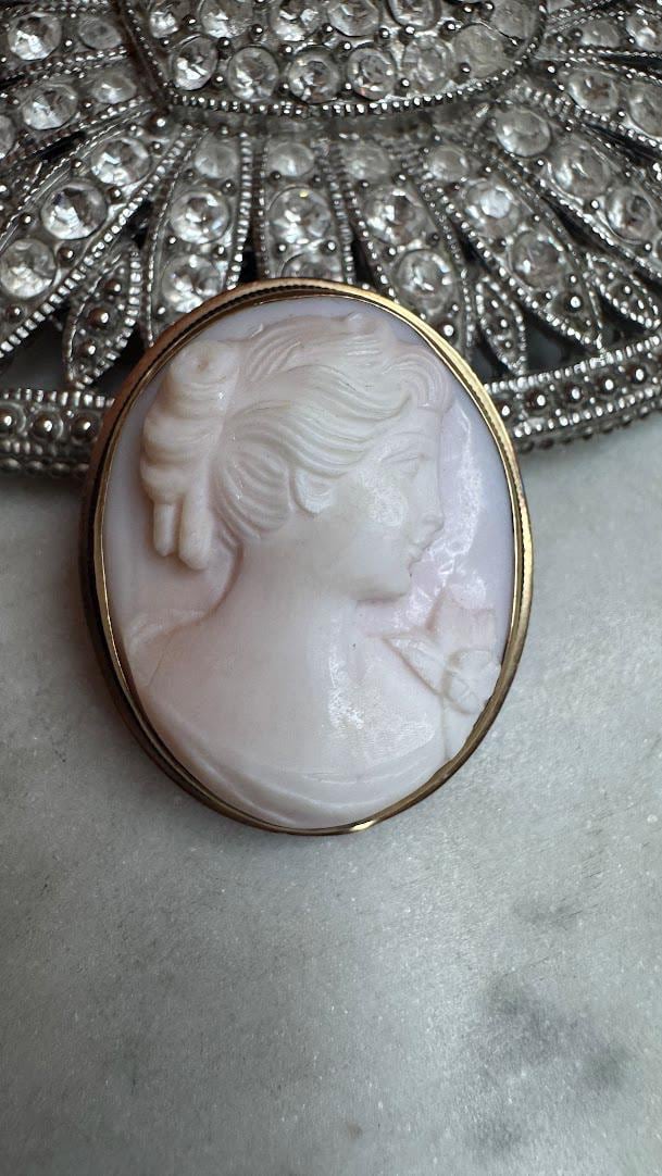 14 kt yellow goldPink Shell Carved Woman Brooch or Pendant7.05 gramsVintage Pre-ownedCondition good with minor surface wear small dent on bottomBeautifully packaged with 100% recycled material