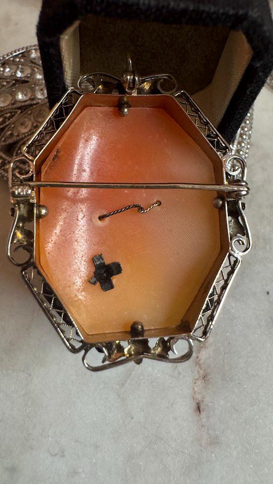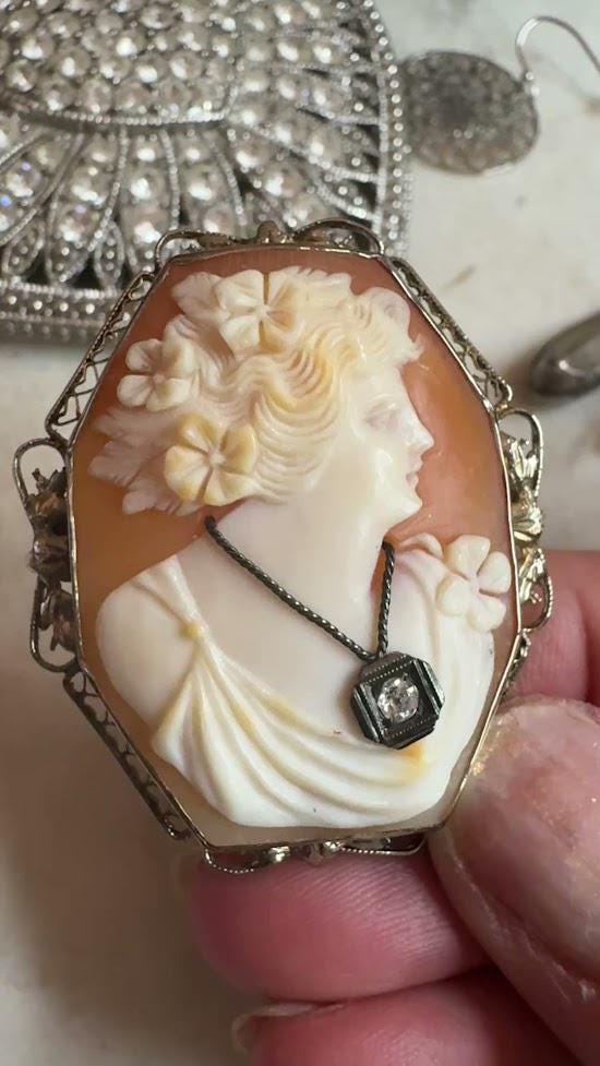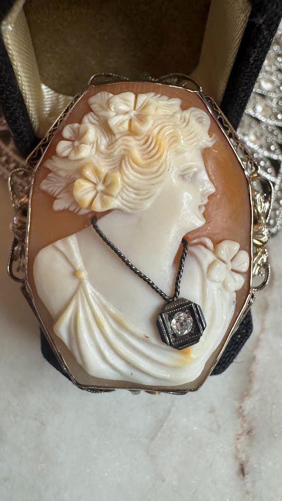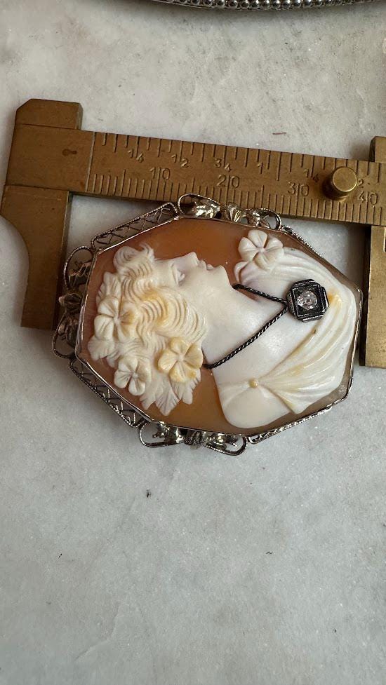 14 kt yellow goldIntricately Shell Carved Woman with Diamond7.05 gramsVintage Pre-ownedCondition good with minor surface wear small dent on bottomBeautifully packaged with 100% recycled material