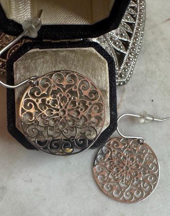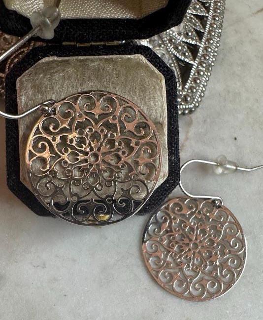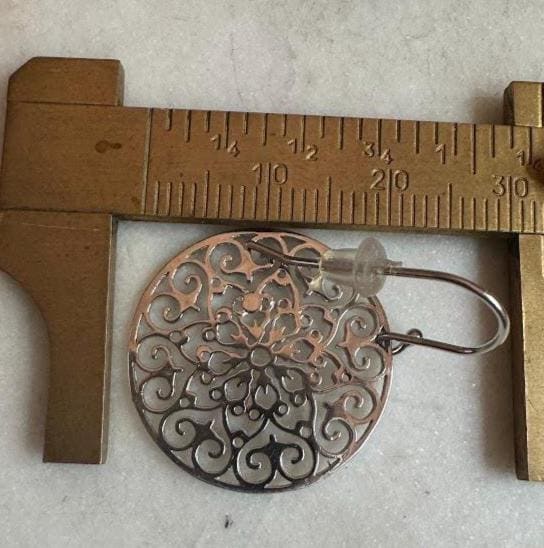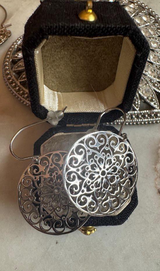 Sterling .925Filigree Round DesignFish hook pierced earring3.22 gramsVintage Pre-owned Condition Good with minor surface wearBox shown not included, Nicely packaged