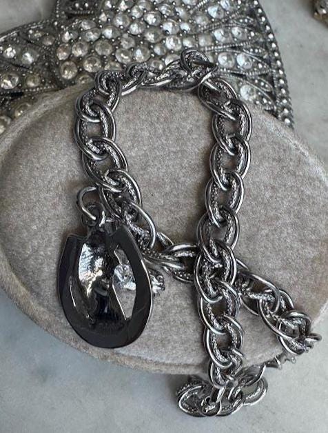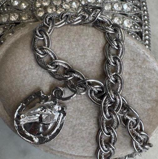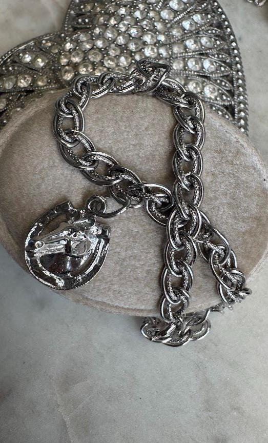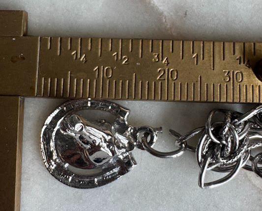 Sterling Silver .925 Rhodium PlatedHorse Charm BraceletDouble link Spring ring clasp 7in length8.78 gramsVintage, Pre-ownedCondition excellent with minor surface wearBox shown not included, Beautifully packaged